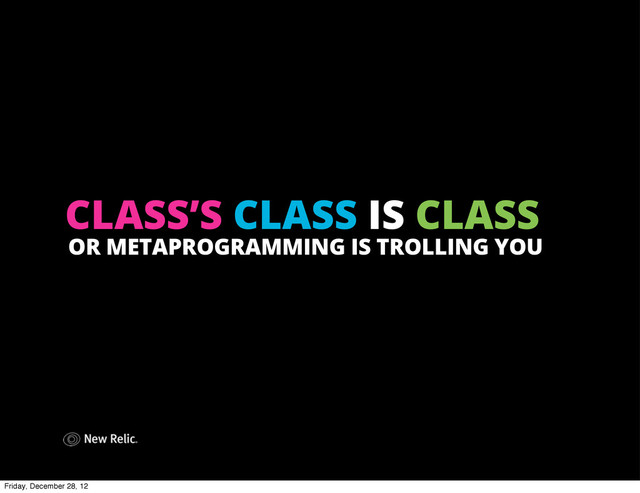 Kernel, BasicObject] gandalf.methods => [:name, :name=, :magic_points, :magic_points=, :cast, :hit_points, :hit_points=, :hit_points, :hit_points=, :nil?, :===, :=~, :~, :eql?, :hash, :<=>, :class, :singleton_class, :clone, :dup, :initialize_dup, :initialize_clone, :taint, :tainted?, :untaint, :untrust, :untrusted?, :trust, :freeze, :frozen?, :to_s, :inspect, :methods, :singleton_methods, :protected_methods, :private_methods, :public_methods, :instance_variables, :instance_variable_get, :instance_variable_set, :instance_variable_defined?, :instance_of?, :kind_of?, :is_a?, :tap, :send, :public_send, :respond_to?, :respond_to_missing?, :extend, :display, :method, :public_method, :define_singleton_method, :object_id, :to_enum, :enum_for, :==, :equal?, :!, :! =, :instance_eval, :instance_exec, :__send__, :__id__] BasicObject.instance_methods => [:==, :equal?, :!, :!=, :instance_eval, :instance_exec, :__send__, :__id__] Friday, December 28, 12