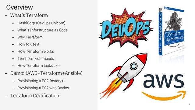 What’s Infrastructure as Code – Why Terraform – How to use it – How Terraform works – Terraform commands – How Terraform looks like – Demo: (AWS+Terraform+Ansible) – Provisioning a EC2 Instance – Provisioning a EC2 with Docker – Terraform Certification