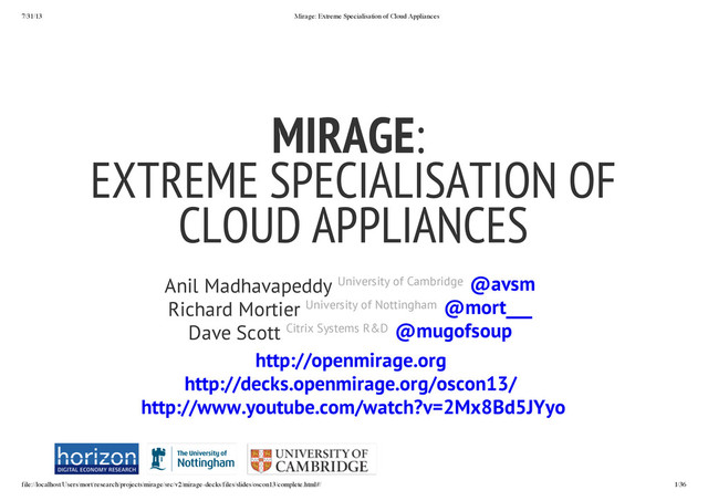 Madhavapeddy University of Cambridge Richard Mortier University of Nottingham Dave Scott Citrix Systems R&D MIRAGE: EXTREME SPECIALISATION OF CLOUD APPLIANCES @avsm @mort___ @mugofsoup http://openmirage.org http://decks.openmirage.org/oscon13/ http://www.youtube.com/watch?v=2Mx8Bd5JYyo