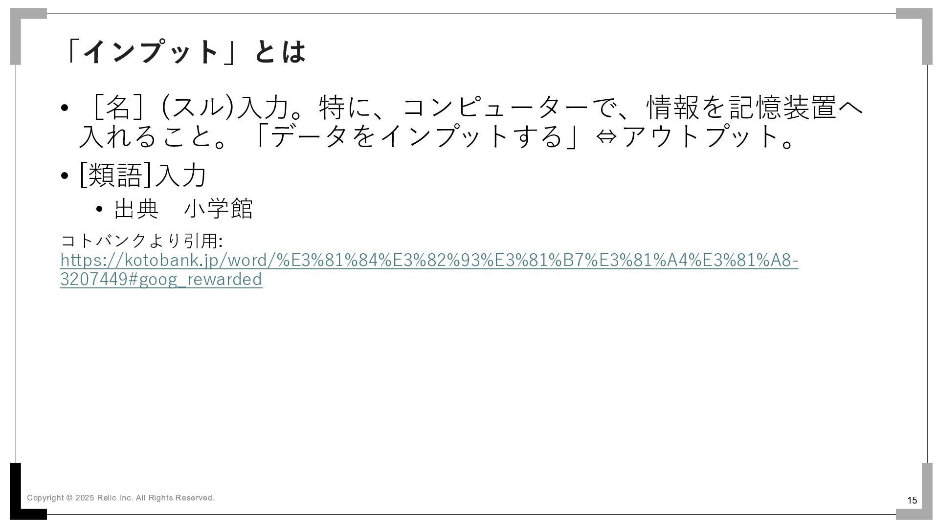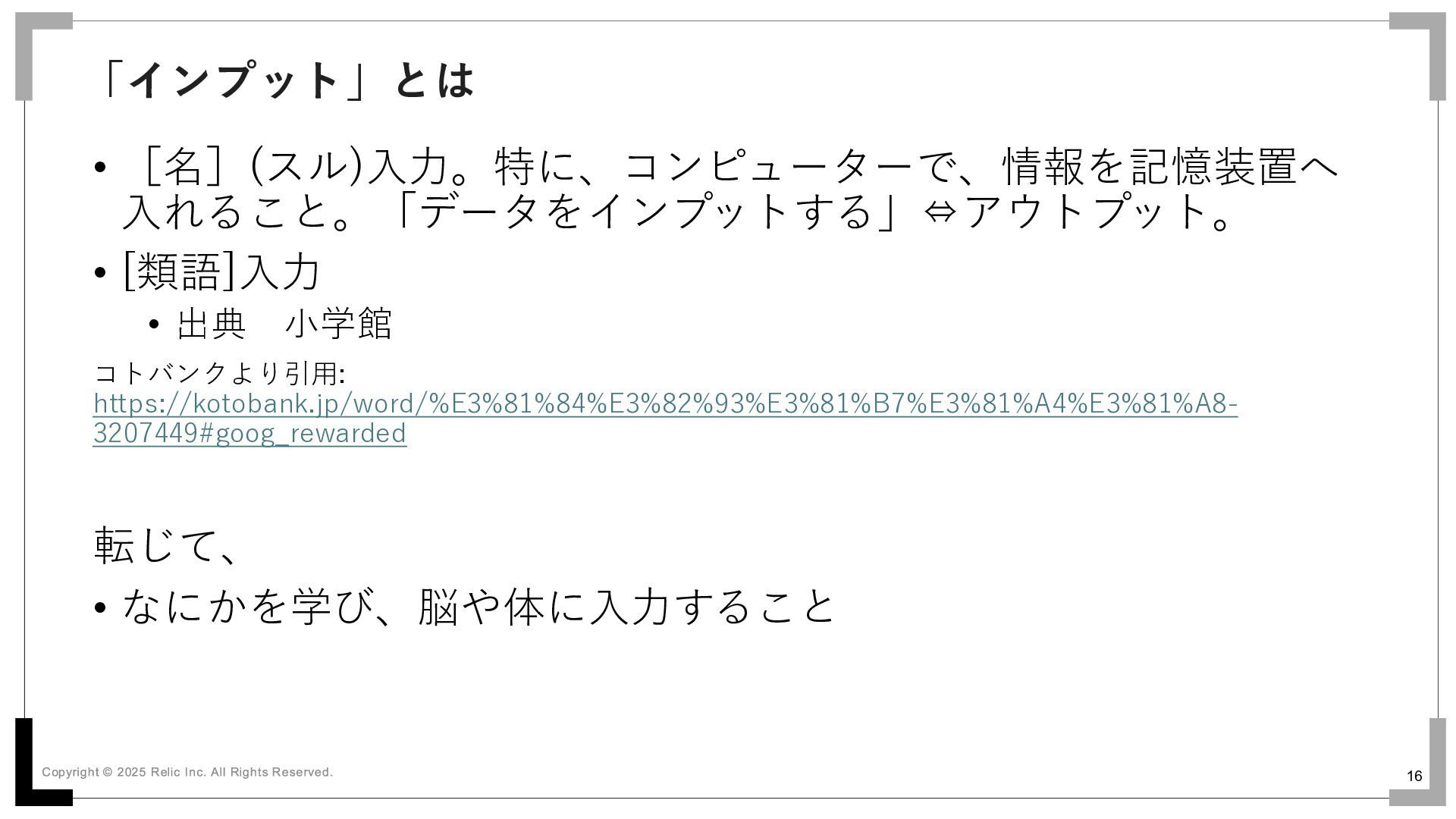 https://kotobank.jp/word/%E3%81%84%E3%82%93%E3%81%B7%E3%81%A4%E3%81%A8- 3207449#goog_rewarded 転じて、 • なにかを学び、脳や体に入力すること 「インプット」とは