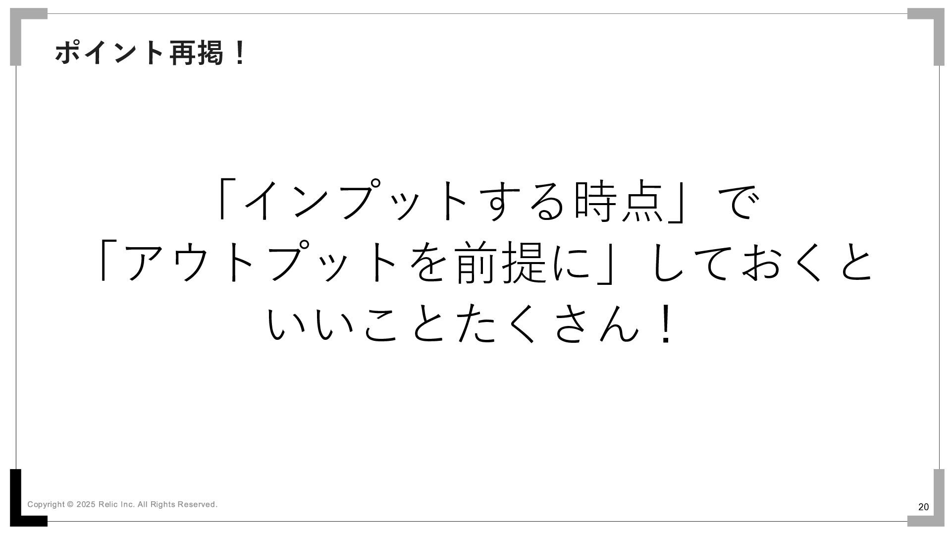 20 「インプットする時点」で 「アウトプットを前提に」しておくと いいことたくさん! ポイント再掲!