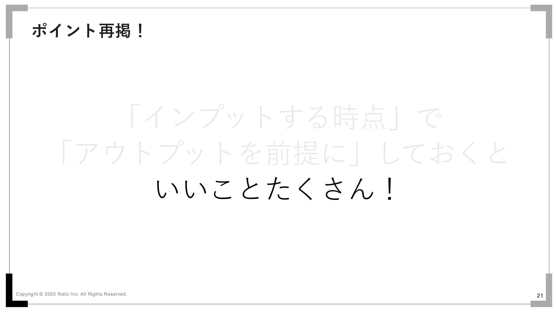 21 「インプットする時点」で 「アウトプットを前提に」しておくと いいことたくさん! ポイント再掲!