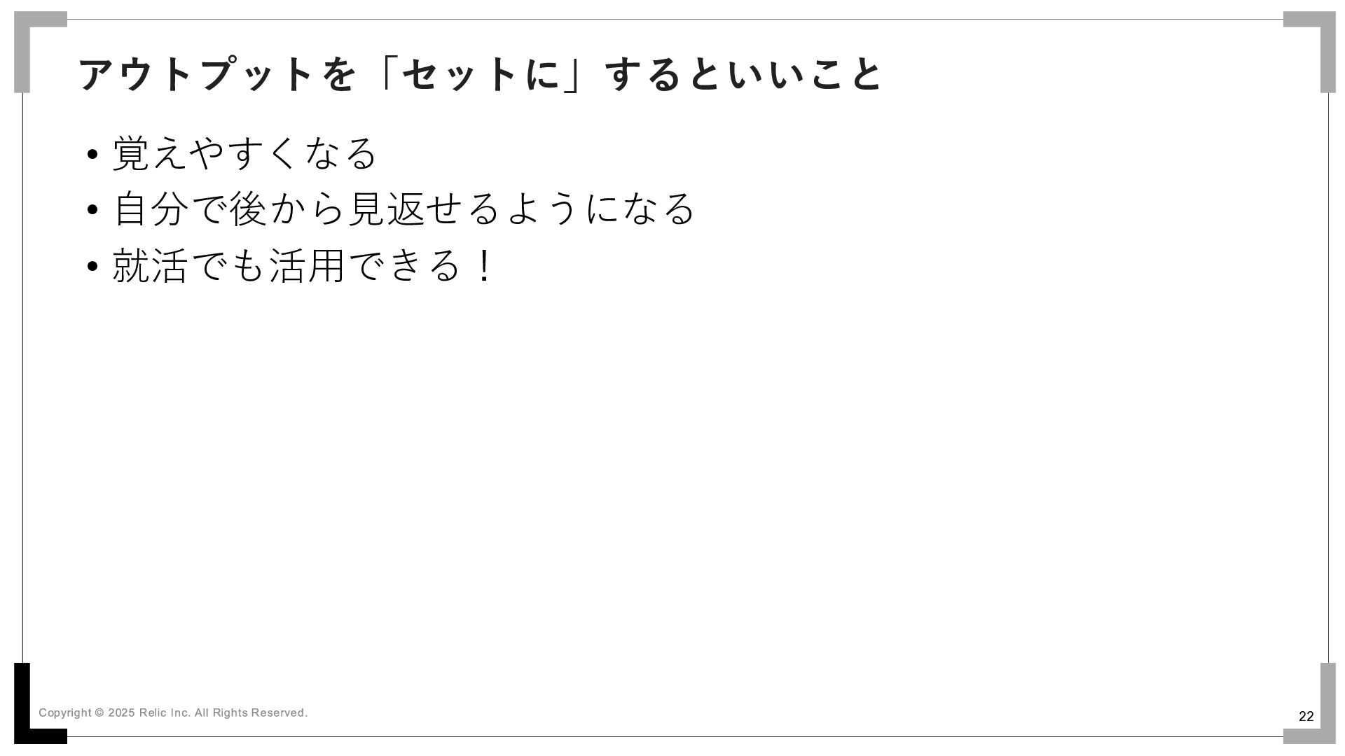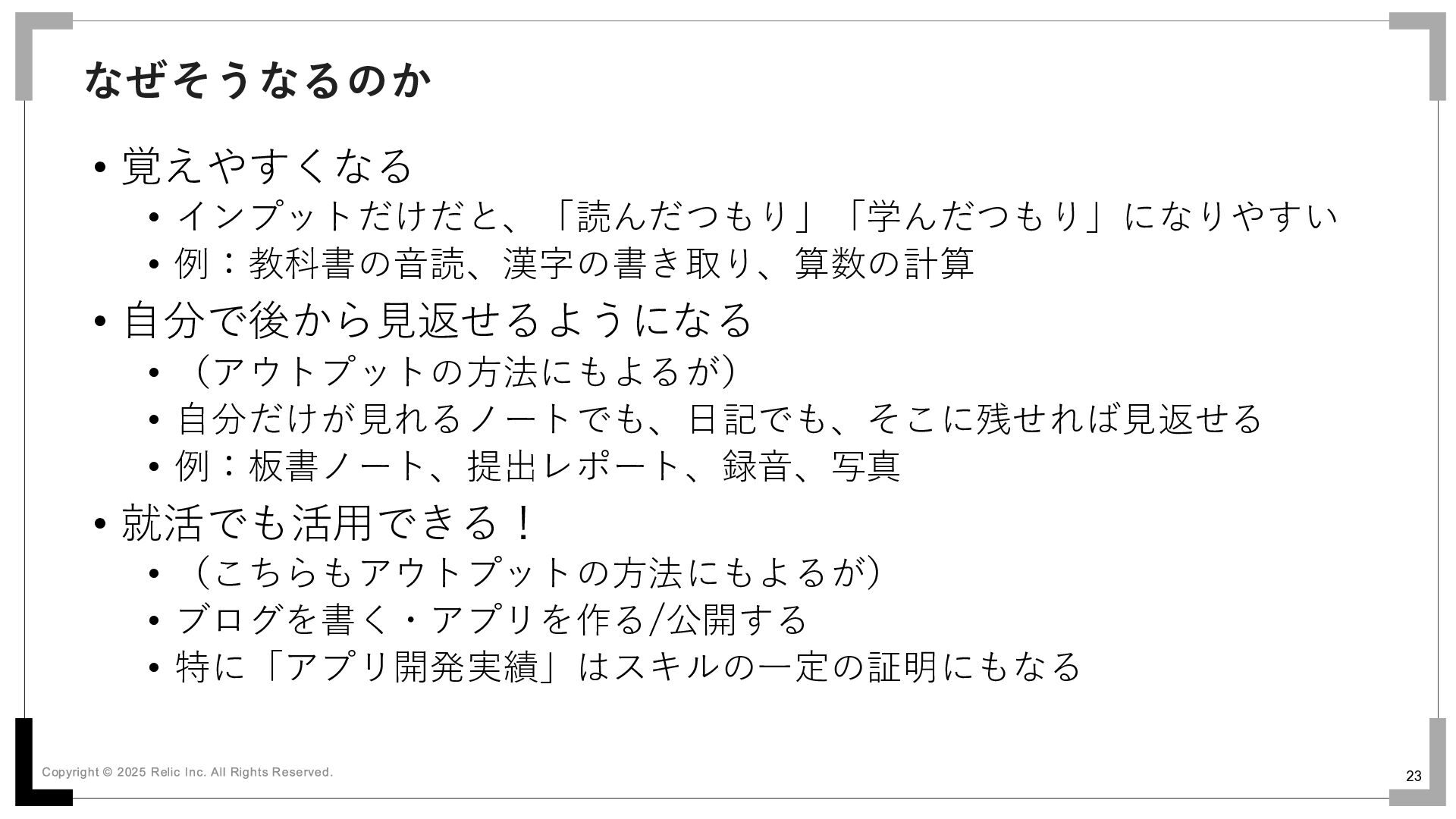 22 • 覚えやすくなる • 自分で後から見返せるようになる • 就活でも活用できる! アウトプットを「セットに」するといいこと