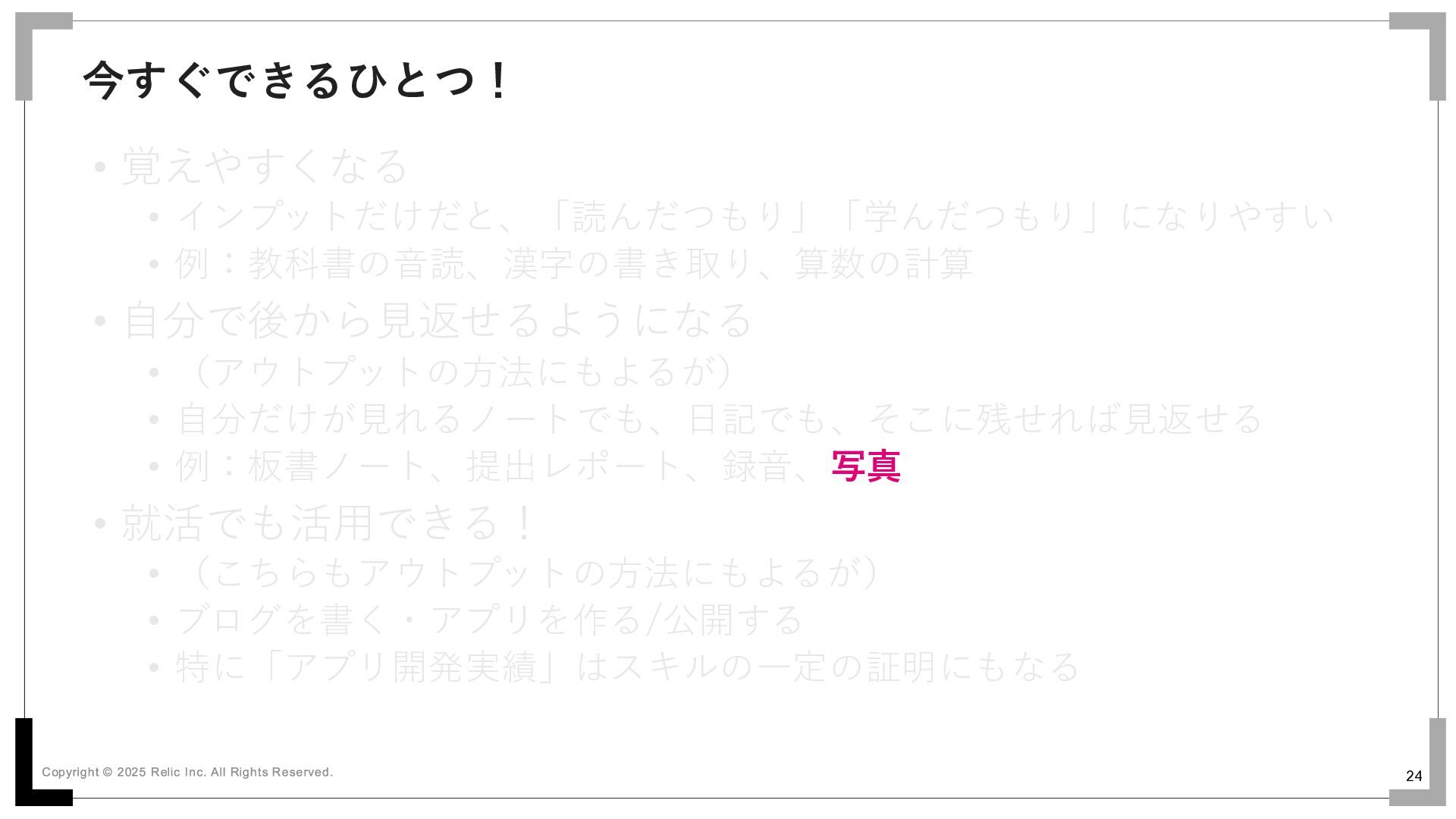 23 • 覚えやすくなる • インプットだけだと、「読んだつもり」「学んだつもり」になりやすい • 例:教科書の音読、漢字の書き取り、算数の計算 • 自分で後から見返せるようになる •