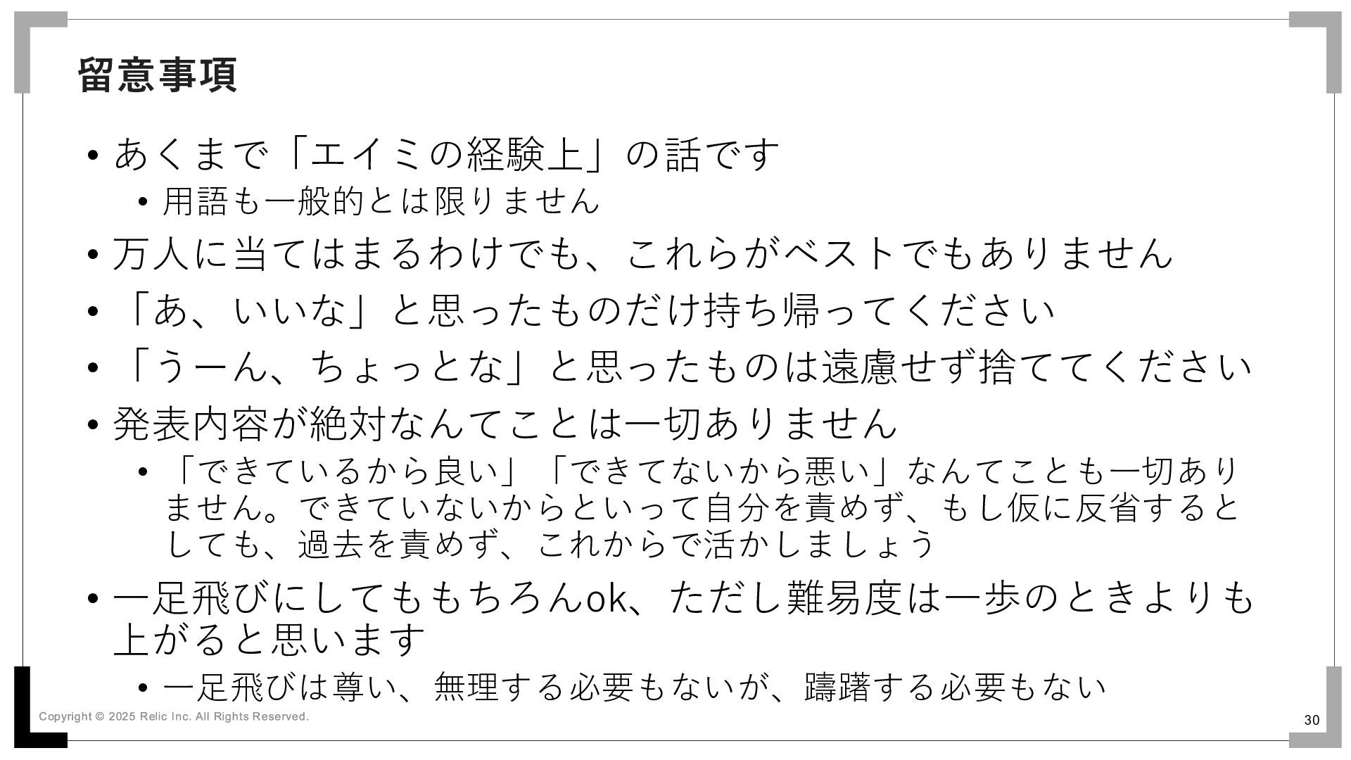 「うーん、ちょっとな」と思ったものは遠慮せず捨ててください • 発表内容が絶対なんてことは一切ありません • 「できているから良い」「できてないから悪い」なんてことも一切あり ません。できていないからといって自分を責めず、もし仮に反省すると しても、過去を責めず、これからで活かしましょう • 一足飛びにしてももちろんok、ただし難易度は一歩のときよりも 上がると思います • 一足飛びは尊い、無理する必要もないが、躊躇する必要もない 留意事項