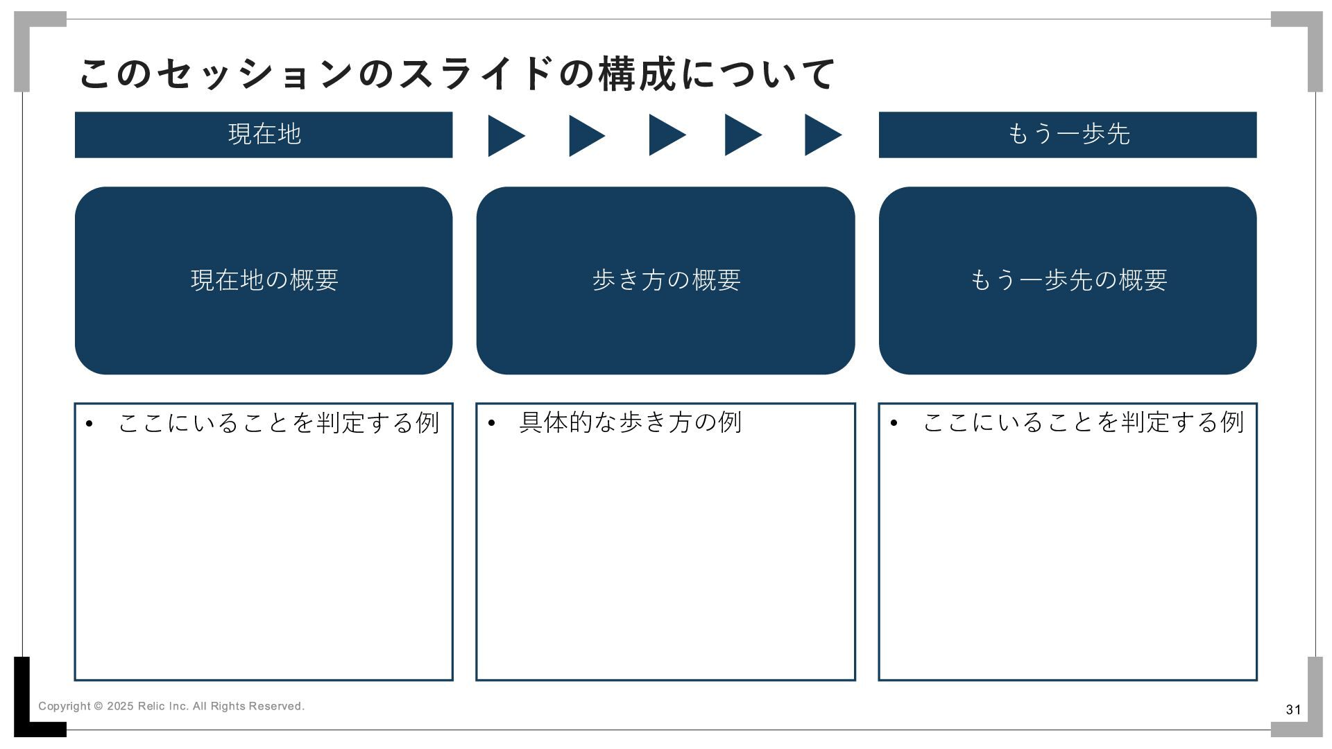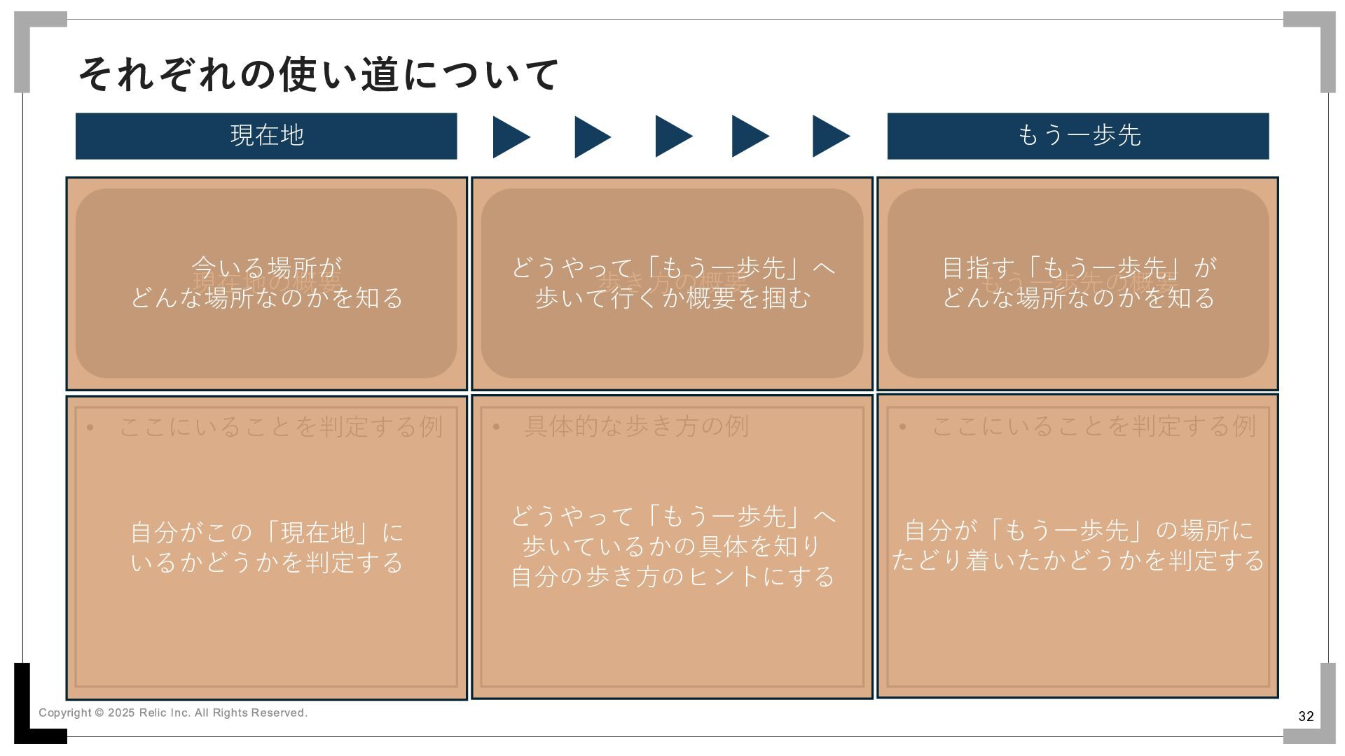 具体的な歩き方の例 • ここにいることを判定する例 今いる場所が どんな場所なのかを知る どうやって「もう一歩先」へ 歩いて行くか概要を掴む 目指す「もう一歩先」が どんな場所なのかを知る 自分がこの「現在地」に いるかどうかを判定する どうやって「もう一歩先」へ 歩いているかの具体を知り 自分の歩き方のヒントにする 自分が「もう一歩先」の場所に たどり着いたかどうかを判定する