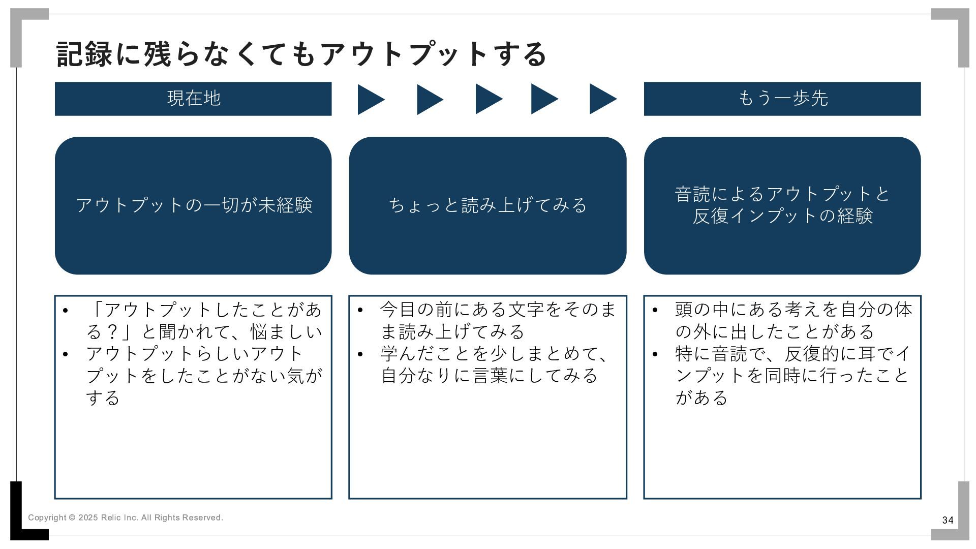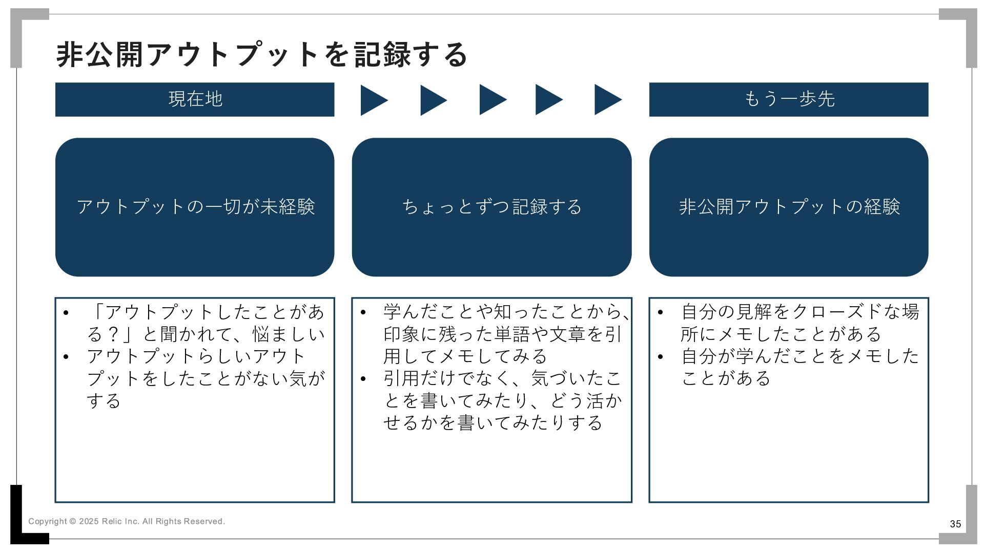 34 記録に残らなくてもアウトプットする 現在地 もう一歩先 アウトプットの一切が未経験 音読によるアウトプットと 反復インプットの経験 ちょっと読み上げてみる • 「アウトプットしたことがあ