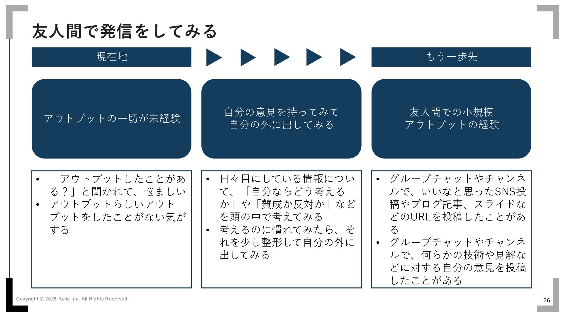 35 非公開アウトプットを記録する 現在地 もう一歩先 アウトプットの一切が未経験 非公開アウトプットの経験 ちょっとずつ記録する • 「アウトプットしたことがあ る?」と聞かれて、悩ましい
