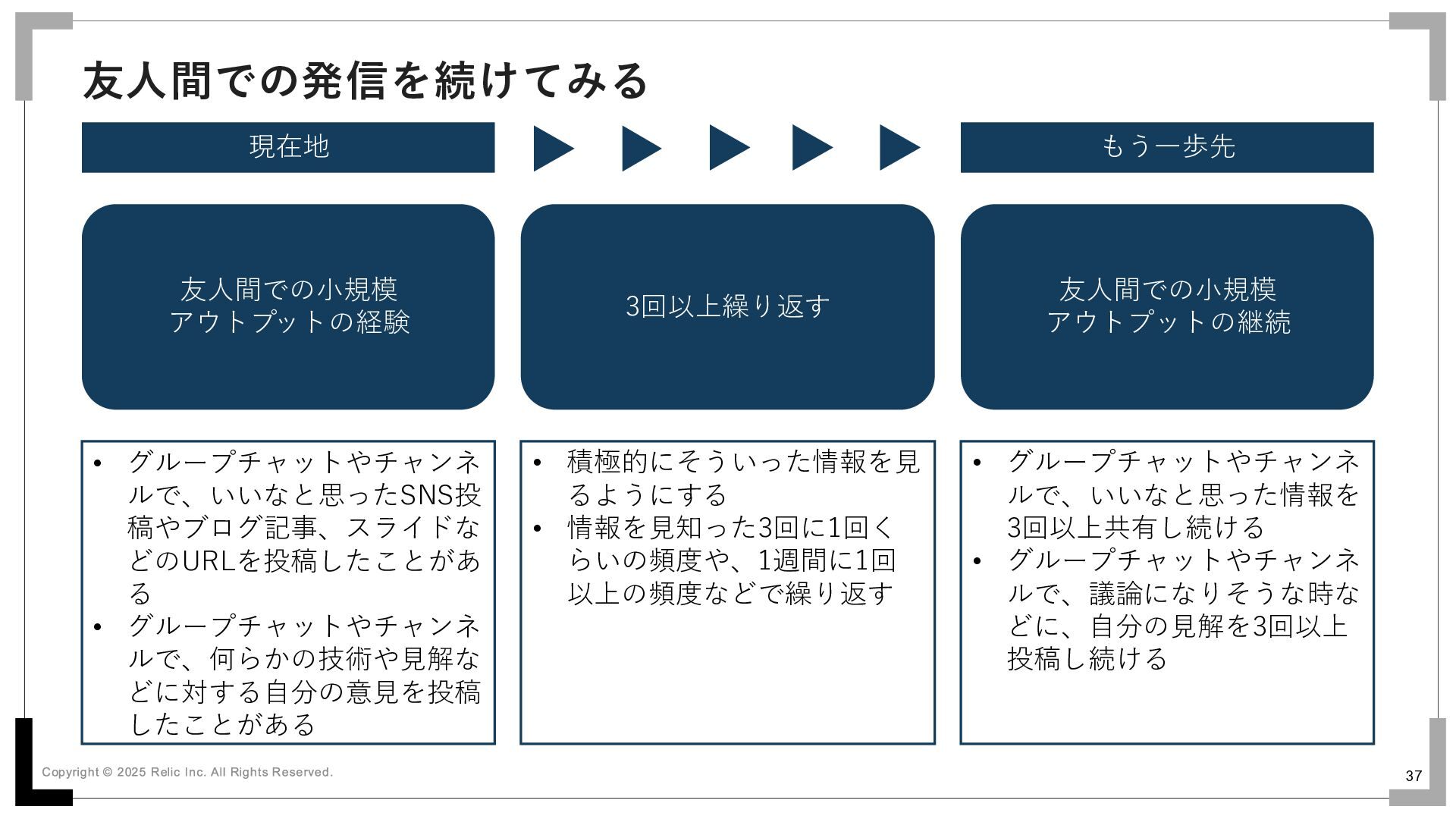 グループチャットやチャンネ ルで、いいなと思ったSNS投 稿やブログ記事、スライドな どのURLを投稿したことがあ る • グループチャットやチャンネ ルで、何らかの技術や見解な どに対する自分の意見を投稿 したことがある • 積極的にそういった情報を見 るようにする • 情報を見知った3回に1回く らいの頻度や、1週間に1回 以上の頻度などで繰り返す • グループチャットやチャンネ ルで、いいなと思った情報を 3回以上共有し続ける • グループチャットやチャンネ ルで、議論になりそうな時な どに、自分の見解を3回以上 投稿し続ける