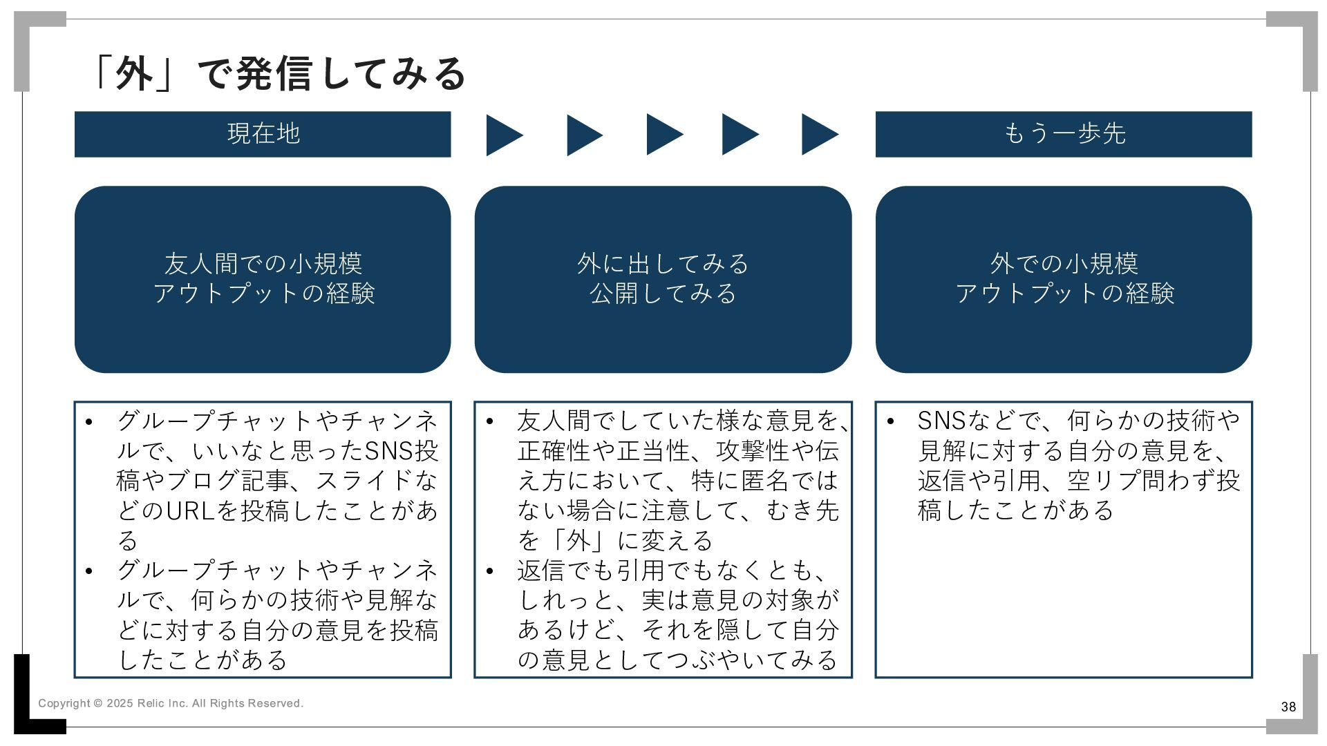37 友人間での発信を続けてみる 現在地 もう一歩先 友人間での小規模 アウトプットの経験 友人間での小規模 アウトプットの継続 3回以上繰り返す •