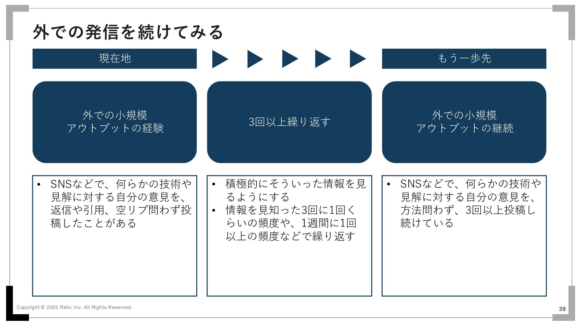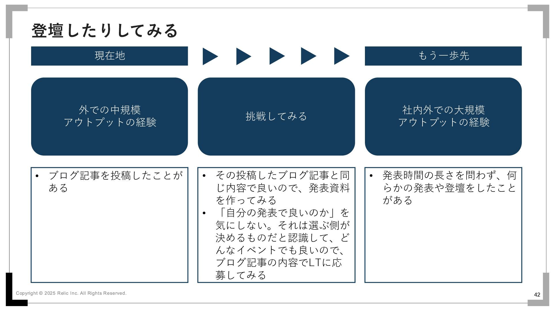 • 発表時間の長さを問わず、何 らかの発表や登壇をしたこと がある • 今までのアウトプットで何が よかったのか、なにがよくな かったのかをふりかえり、知 る • 聴衆に話しかけたり連絡し て、FBを聞いてみる • 知ったところから、ではどう すればもっと良くできるのか 考えて、それを実行する • 社内外問わず、これまで社内 なら社内のまま、これまで社 外なら社外のまま、聴講者数 やFB数、資料閲覧数などが 以前より増えている • 登壇だけでなくハンズオンや 勉強会の教える側になったこ とがある