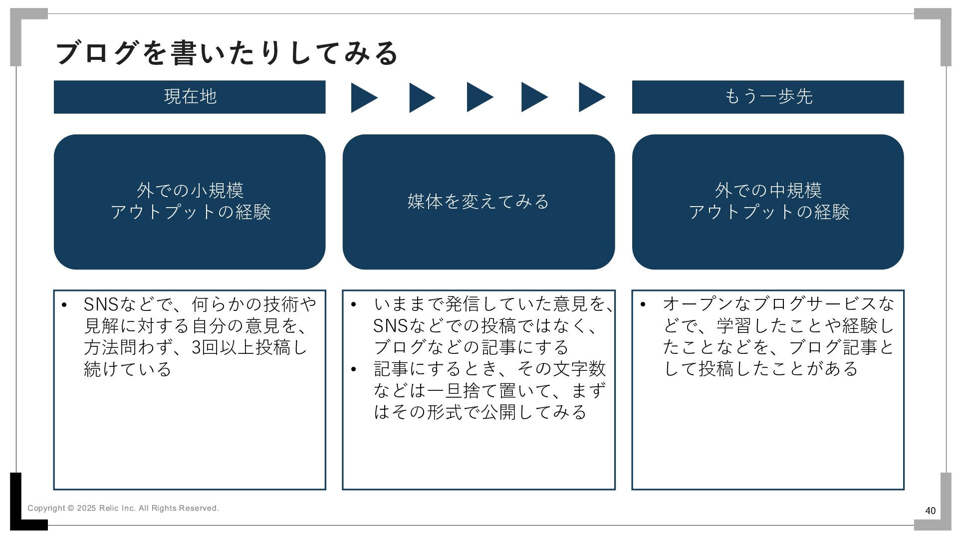 39 外での発信を続けてみる 現在地 もう一歩先 外での小規模 アウトプットの経験 外での小規模 アウトプットの継続 3回以上繰り返す •