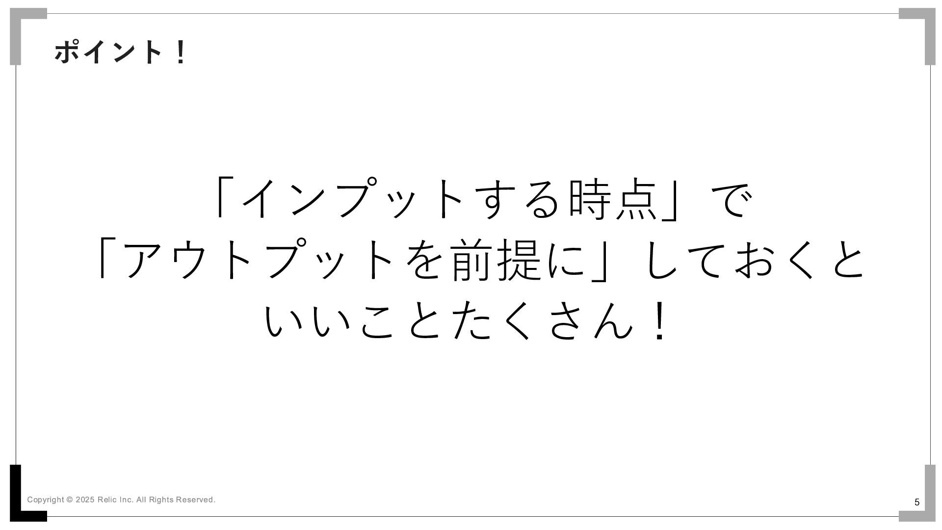 5 「インプットする時点」で 「アウトプットを前提に」しておくと いいことたくさん! ポイント!