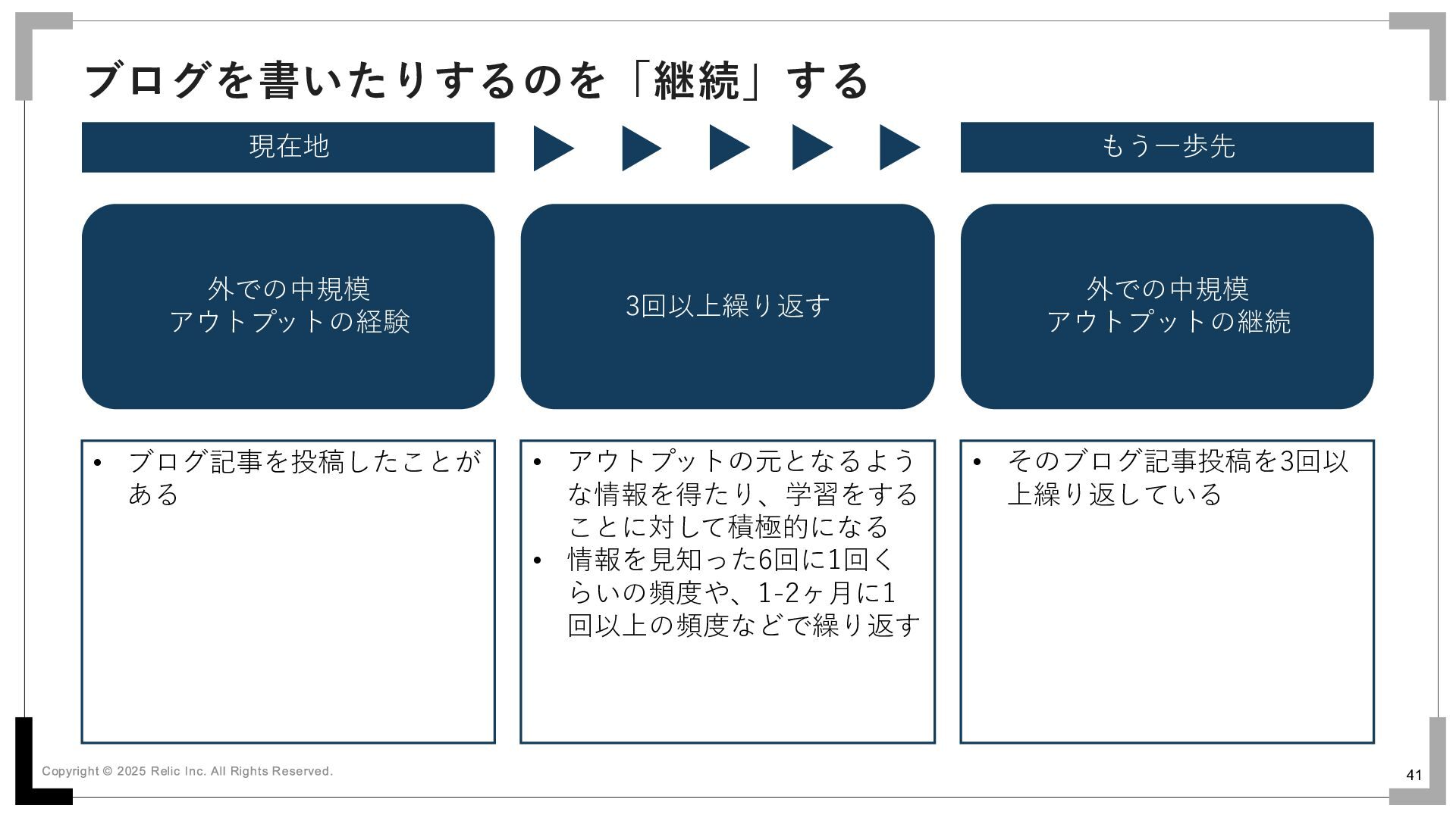 41 ブログを書いたりするのを「継続」する 現在地 もう一歩先 外での中規模 アウトプットの経験 外での中規模 アウトプットの継続 3回以上繰り返す •