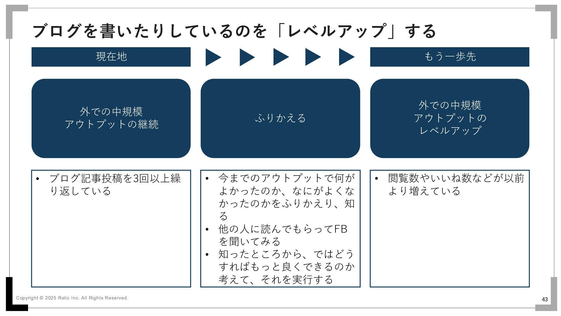 43 ブログを書いたりしているのを「レベルアップ」する 現在地 もう一歩先 外での中規模 アウトプットの継続 外での中規模 アウトプットの レベルアップ ふりかえる