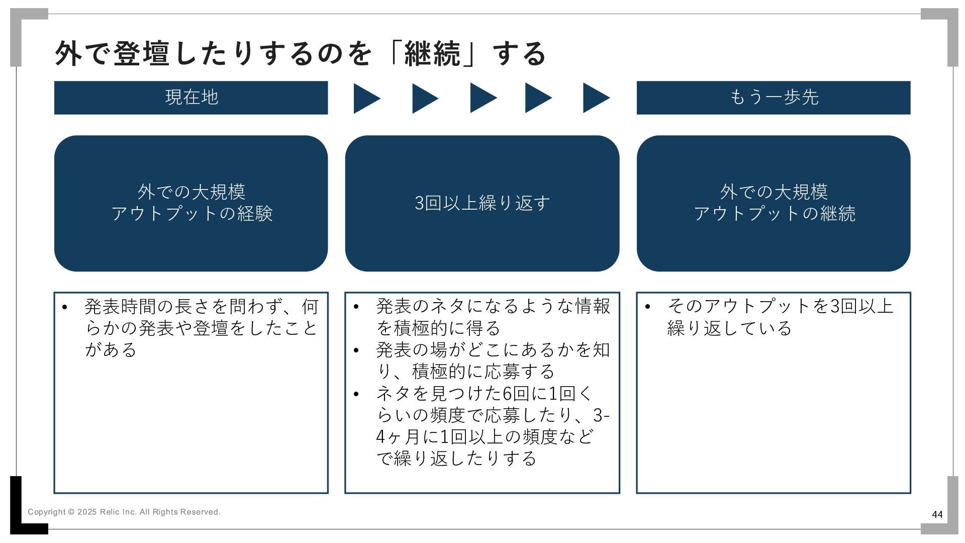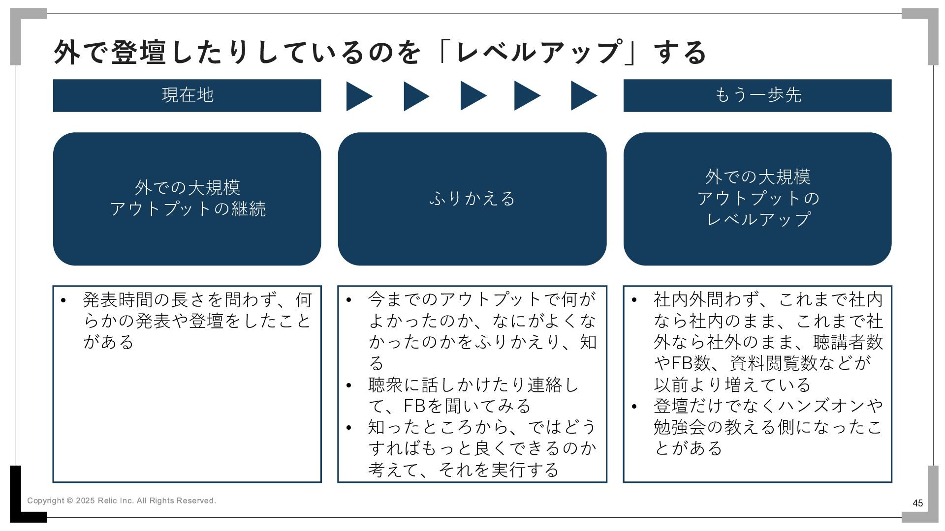 44 外で登壇したりするのを「継続」する 現在地 もう一歩先 外での大規模 アウトプットの経験 外での大規模 アウトプットの継続 3回以上繰り返す •