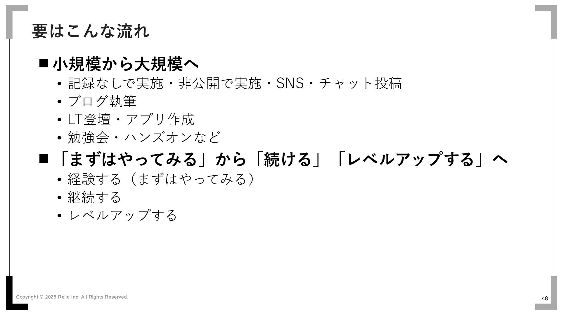 48 小規模から大規模へ • 記録なしで実施・非公開で実施・SNS・チャット投稿 • ブログ執筆 • LT登壇・アプリ作成 • 勉強会・ハンズオンなど