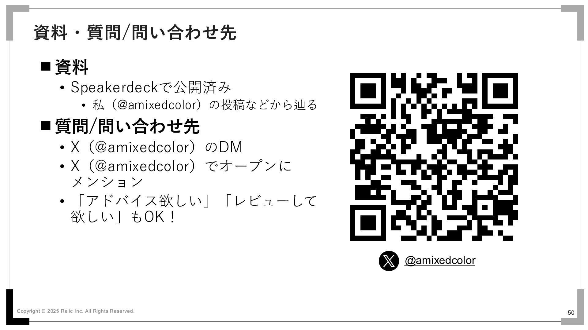 50 資料 • Speakerdeckで公開済み • 私(@amixedcolor)の投稿などから辿る 質問/問い合わせ先 • X(@amixedcolor)のDM •