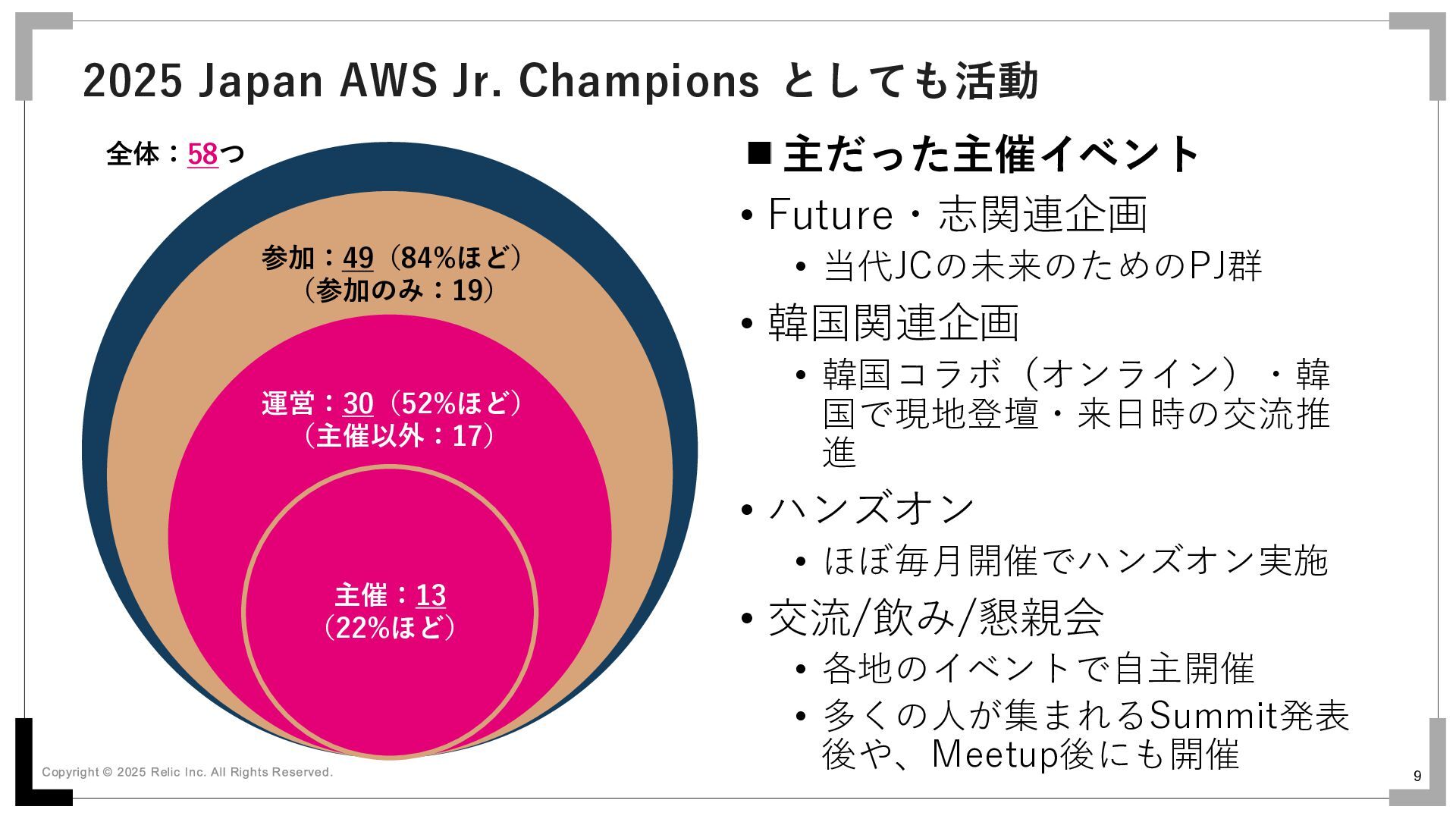 国で現地登壇・来日時の交流推 進 • ハンズオン • ほぼ毎月開催でハンズオン実施 • 交流/飲み/懇親会 • 各地のイベントで自主開催 • 多くの人が集まれるSummit発表 後や、Meetup後にも開催 2025 Japan AWS Jr. Champions としても活動 全体:58つ 参加:49(84%ほど) (参加のみ:19) 運営:30(52%ほど) (主催以外:17) 主催:13 (22%ほど)