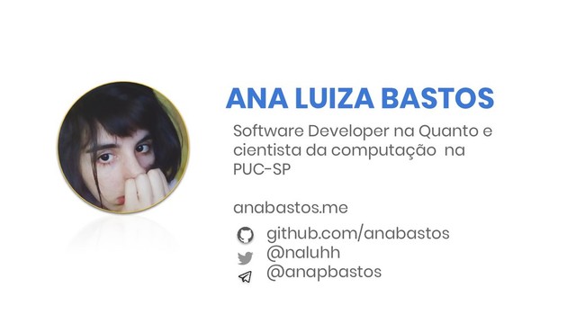ANA LUIZA BASTOS github.com/anabastos @naluhh @anapbastos Software Developer na Quanto