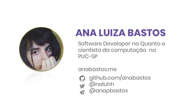 ANA LUIZA BASTOS github.com/anabastos @naluhh @anapbastos Software Developer na Quanto