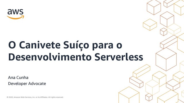 rights reserved. SAM SAM Templates • Infraestrutura como código • Aplicações Serverless • Sintaxe abreviada • Definir recursos e event sources SAM CLI • Conjunto de ferramentas • Desenvolvimento local • Debugging • Build, package, deploy