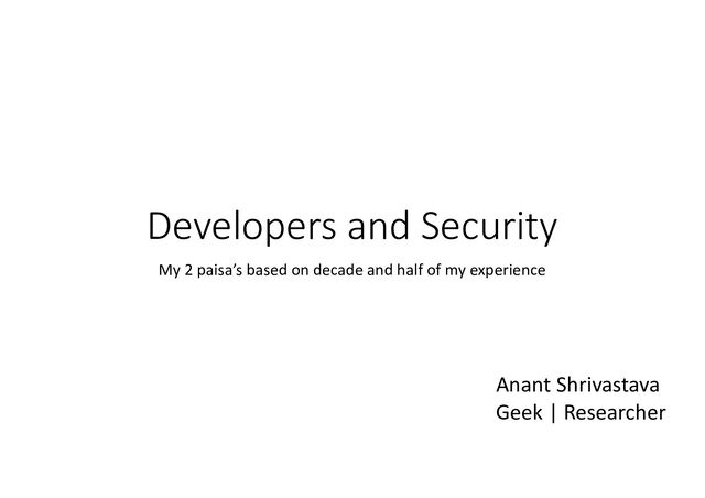 repeat no one other then dev knows code better • Leverage security team and support function: • Take inputs from them as early and as often as possible • Take final ownership of product in your hand • If security team acts as bottleneck they are doing it wrong
