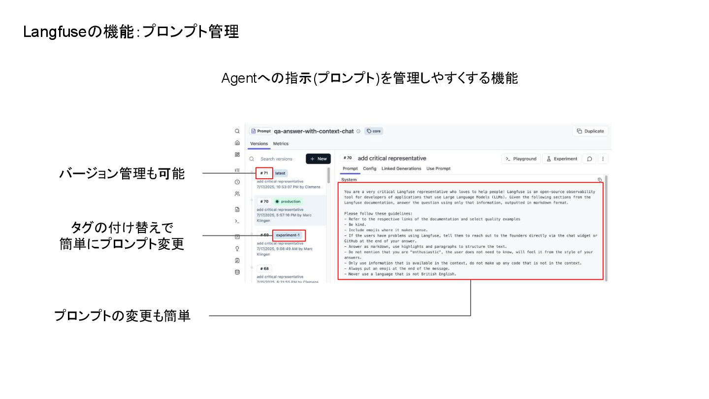 Langfuseの機能:プロンプト管理 Agentへの指示(プロンプト)を管理しやすくする機能 バージョン管理も可能 タグの付け替えで 簡単にプロンプト変更 プロンプトの変更も簡単