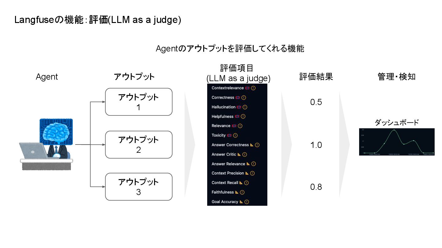 Langfuseの機能:評価(LLM as a judge) Agentのアウトプットを評価してくれる機能 アウトプット 1 アウトプット 2 アウトプット