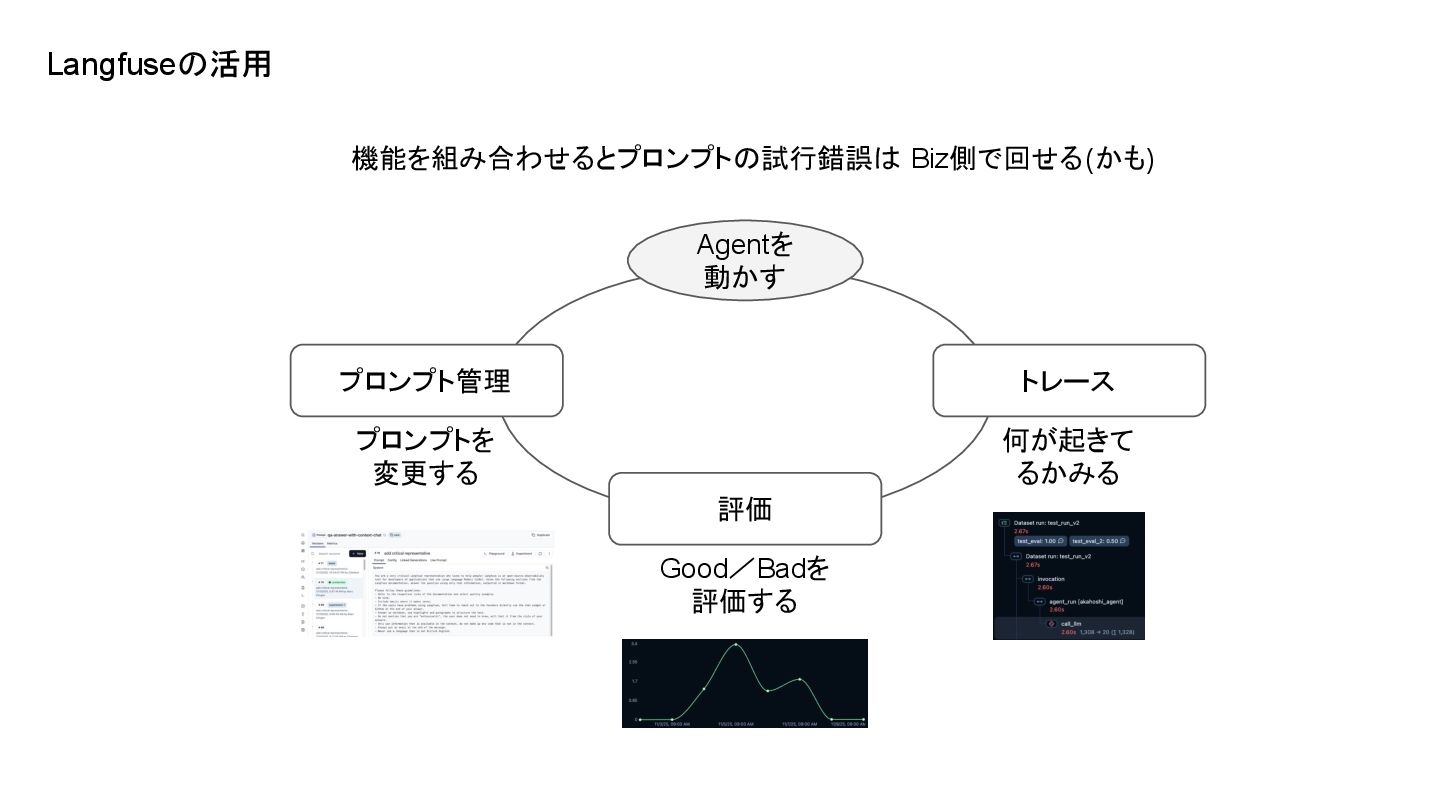 Langfuseの活用 機能を組み合わせるとプロンプトの試行錯誤は Biz側で回せる(かも) トレース プロンプト管理 プロンプトを 変更する 何が起きて るかみる Good/Badを