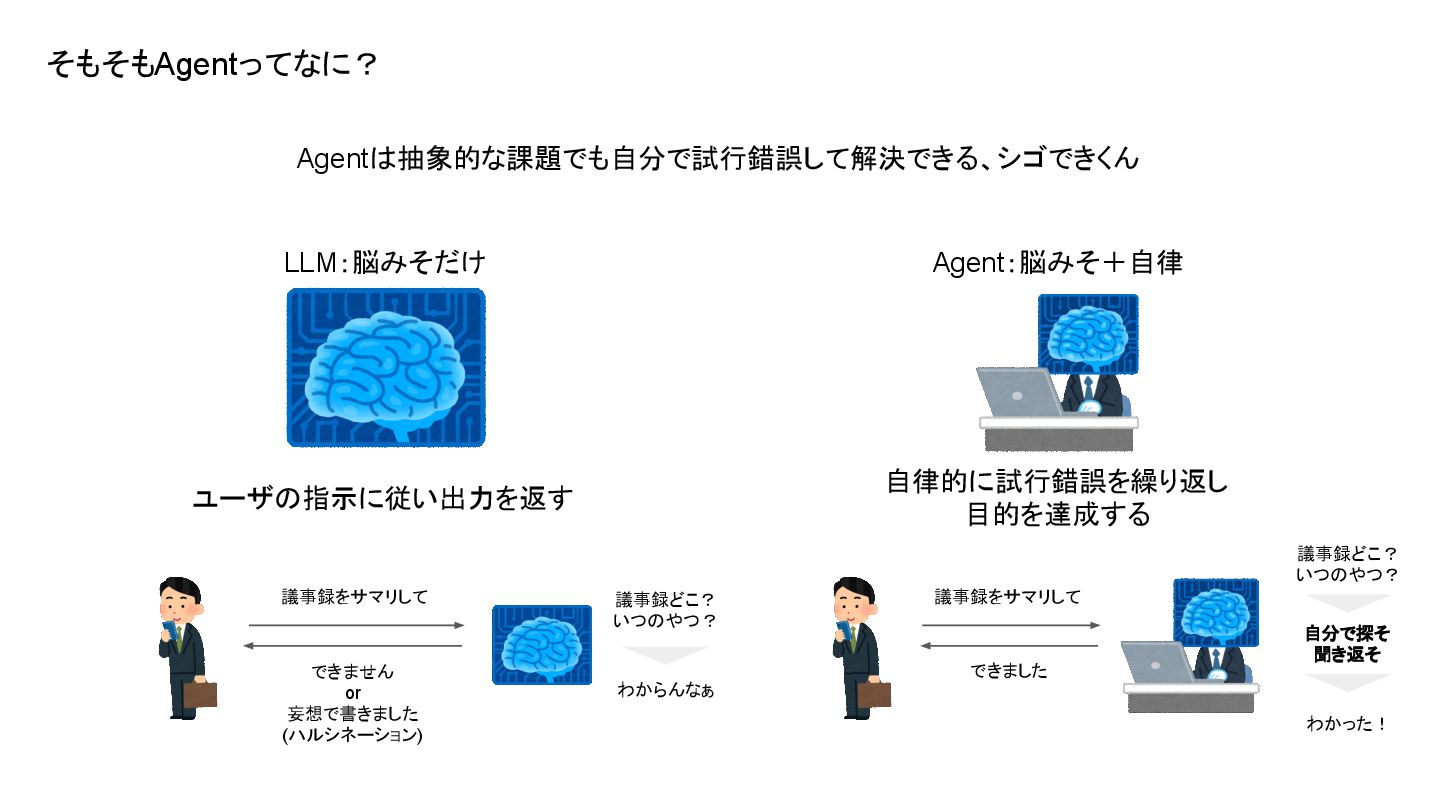 そもそもAgentってなに? Agentは抽象的な課題でも自分で試行錯誤して解決できる、シゴできくん ユーザの指示に従い出力を返す LLM:脳みそだけ 自律的に試行錯誤を繰り返し 目的を達成する Agent:脳みそ+自律 議事録をサマリして できません or