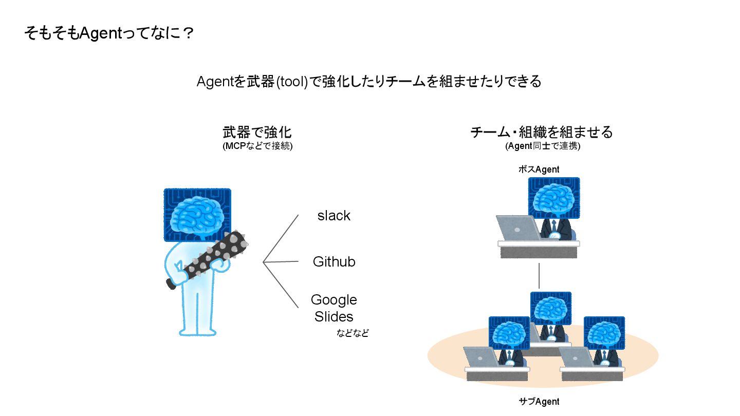 そもそもAgentってなに? Agentを武器(tool)で強化したりチームを組ませたりできる チーム・組織を組ませる (Agent同士で連携) 武器で強化 (MCPなどで接続) slack Github Google Slides
