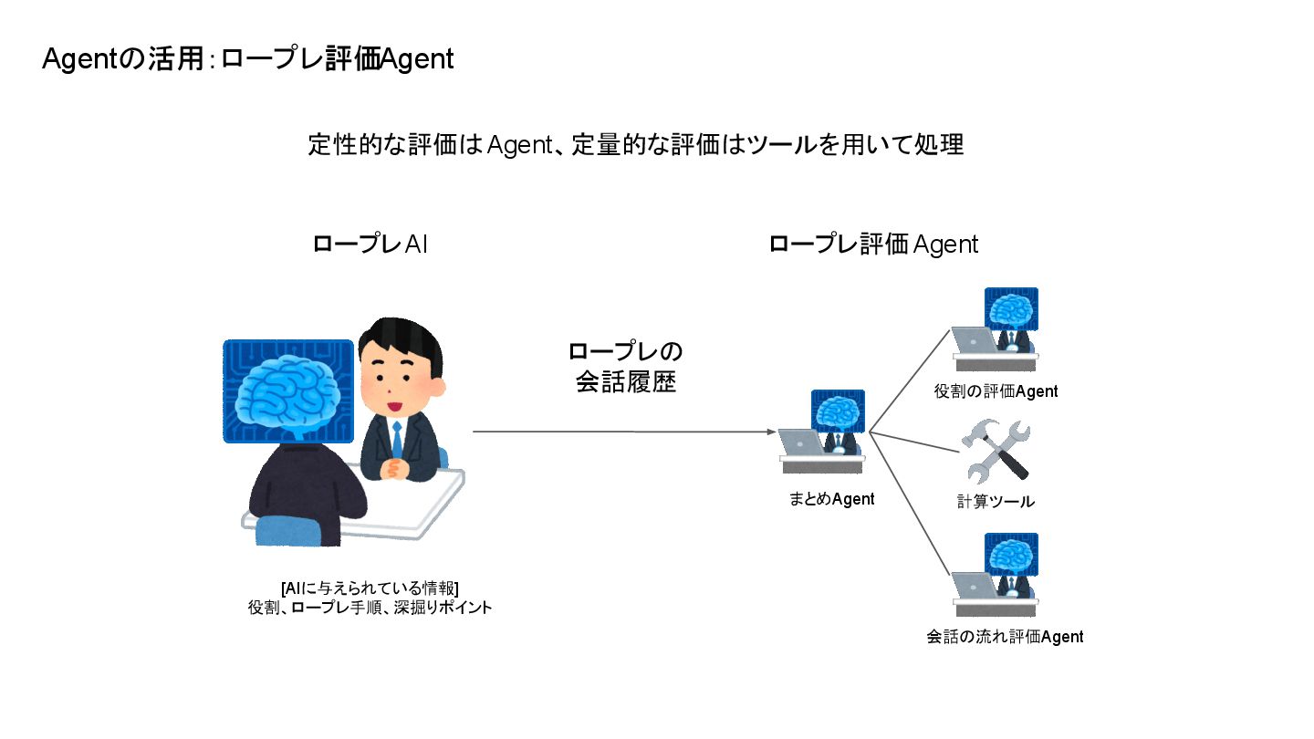 Agentの活用:ロープレ評価Agent ロープレ評価Agent ロープレAI 定性的な評価はAgent、定量的な評価はツールを用いて処理 ロープレの 会話履歴 [AIに与えられている情報] 役割、ロープレ手順、深掘りポイント 役割の評価Agent 計算ツール