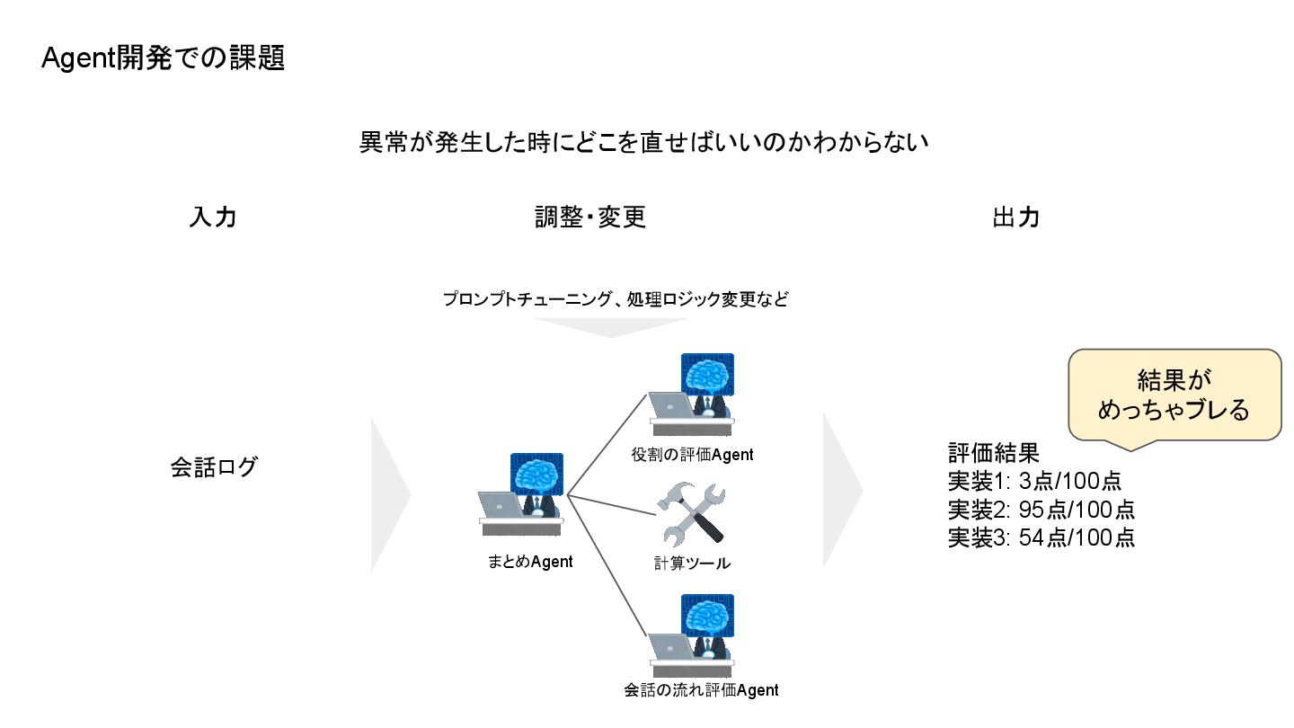 Agent開発での課題 異常が発生した時にどこを直せばいいのかわからない 調整・変更 役割の評価Agent 計算ツール まとめAgent 会話の流れ評価Agent 出力 入力 会話ログ