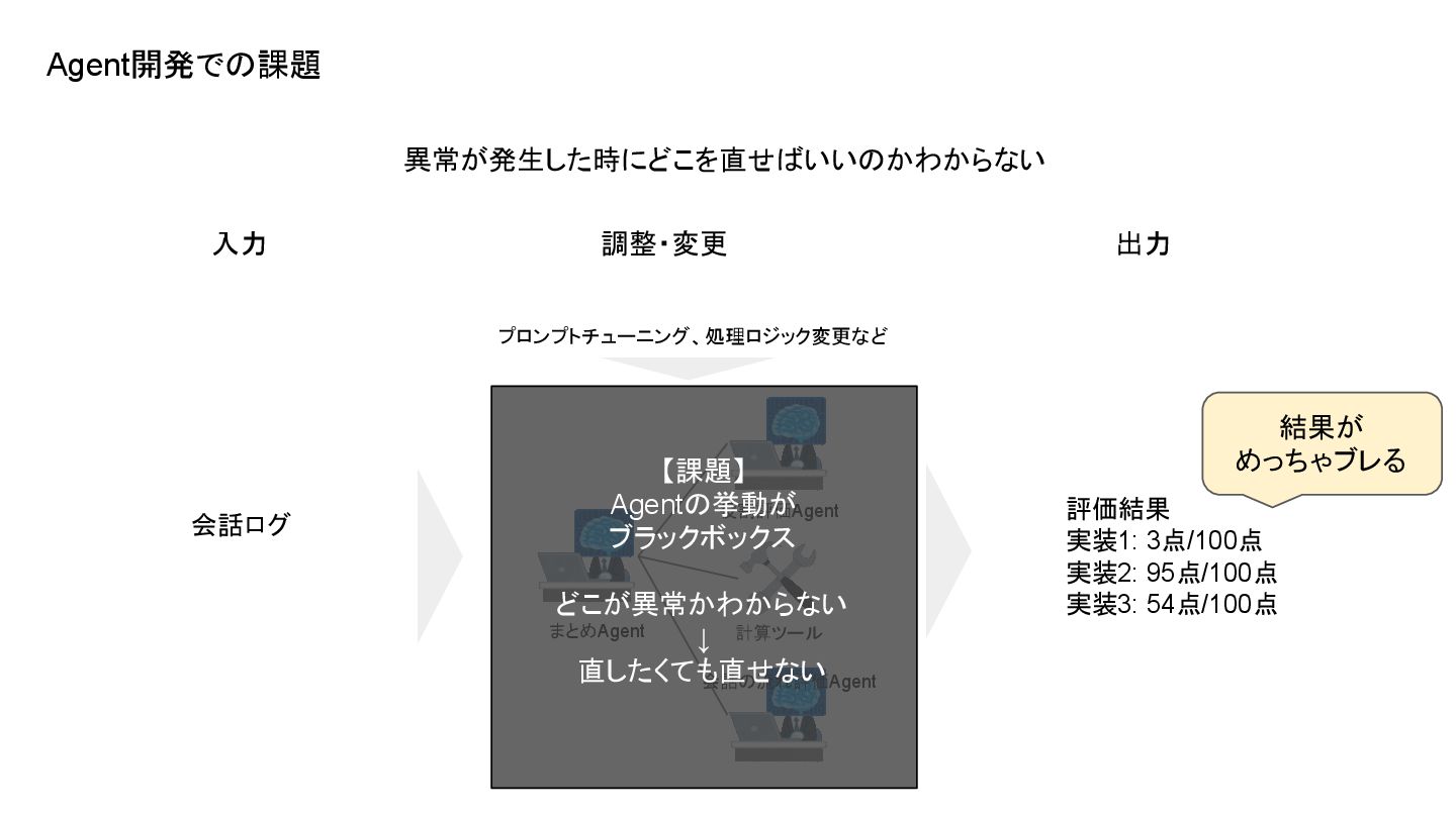 実装1: 3点/100点 実装2: 95点/100点 実装3: 54点/100点 【課題】 Agentの挙動が ブラックボックス どこが異常かわからない ↓ 直したくても直せない 調整・変更 プロンプトチューニング、処理ロジック変更など 結果が めっちゃブレる