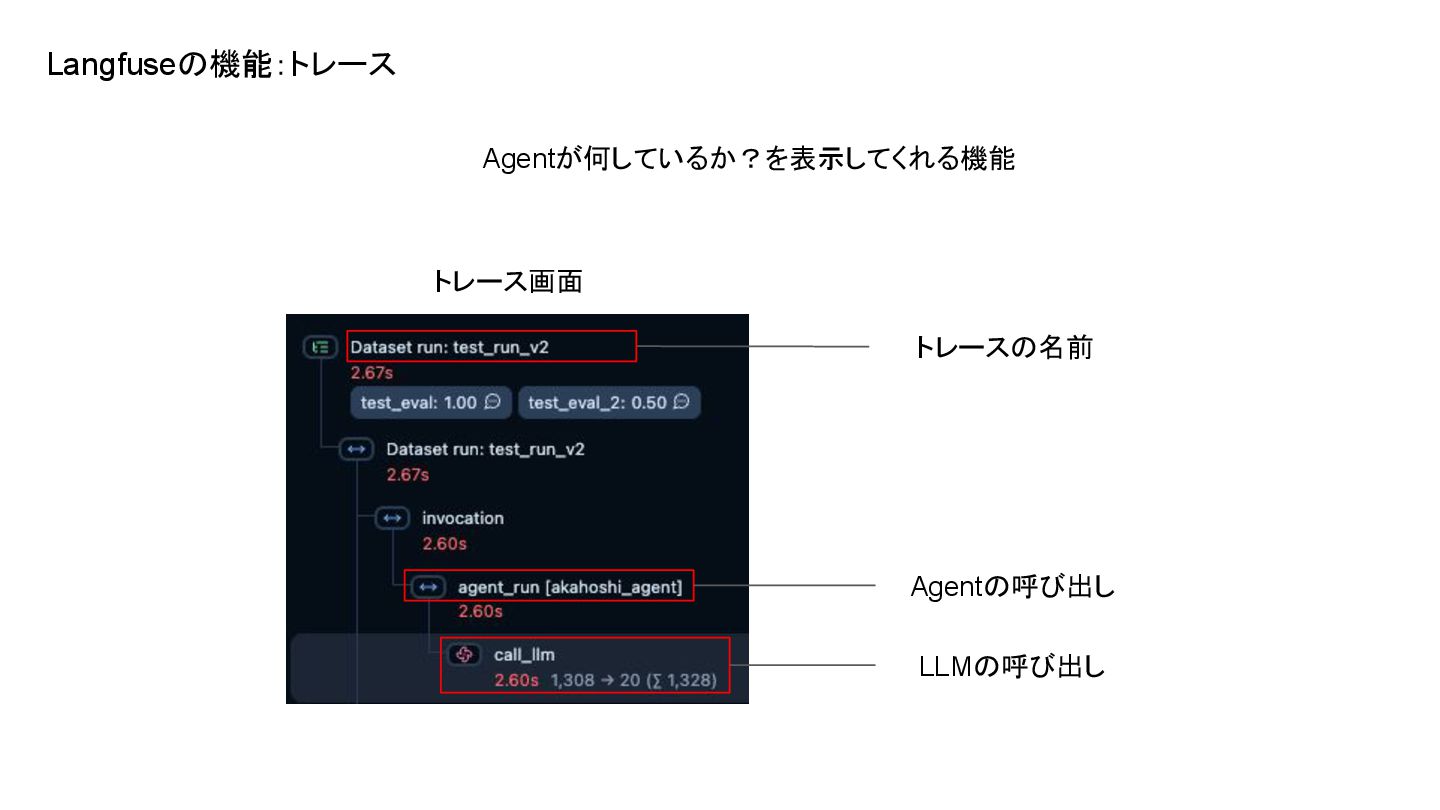 Langfuseの機能:トレース Agentが何しているか?を表示してくれる機能 Agentの呼び出し LLMの呼び出し トレースの名前 トレース画面