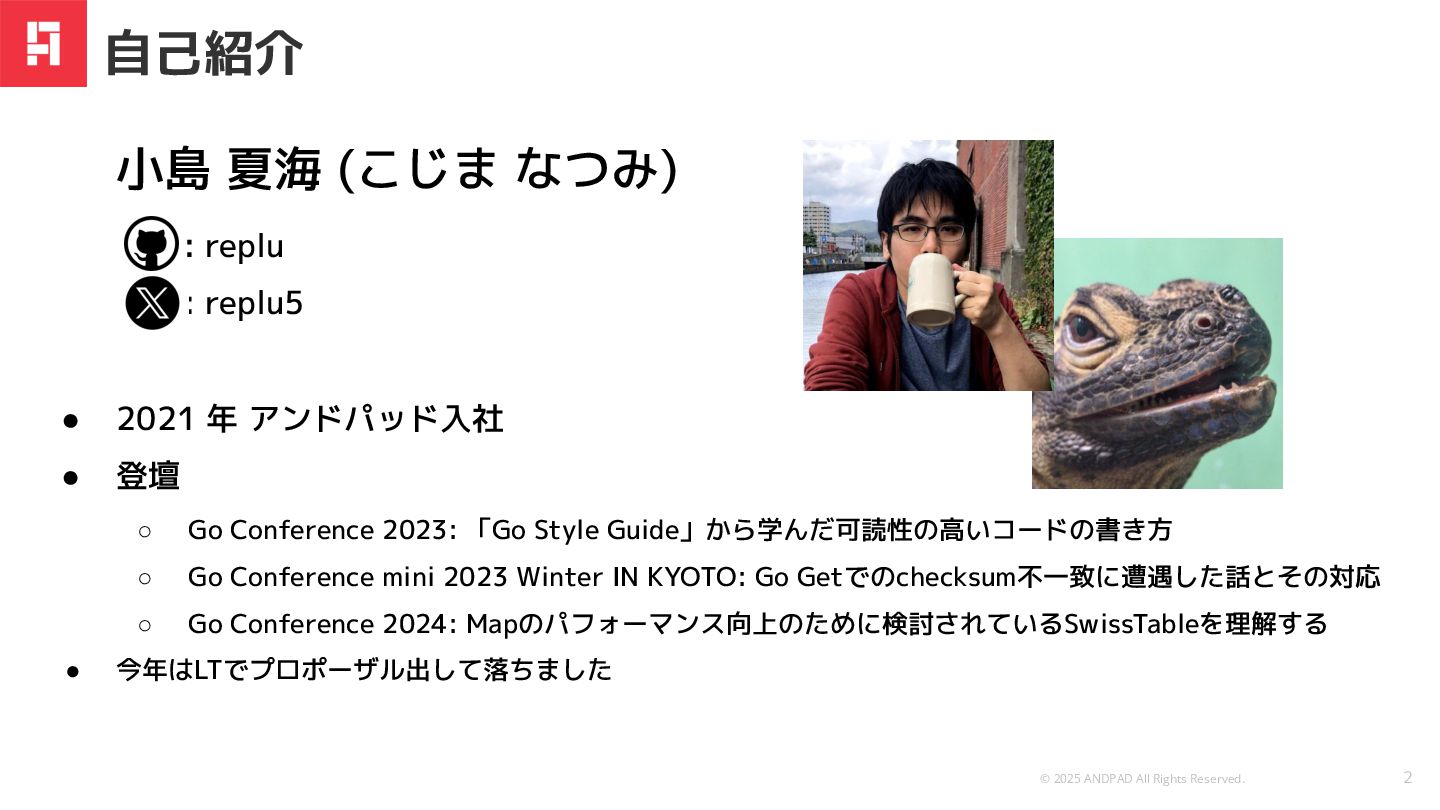 (こじま なつみ) : replu : replu5 • 2021 年 アンドパッド入社 • 登壇 ◦ Go Conference 2023: 「Go Style Guide」から学んだ可読性の高いコードの書き方 ◦ Go Conference mini 2023 Winter IN KYOTO: Go Getでのchecksum不一致に遭遇した話とその対応 ◦ Go Conference 2024: Mapのパフォーマンス向上のために検討されているSwissTableを理解する • 今年はLTでプロポーザル出して落ちました