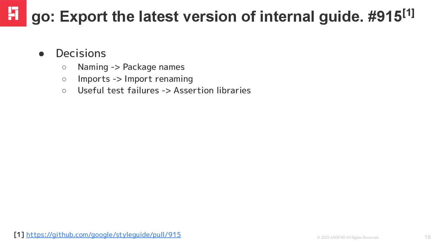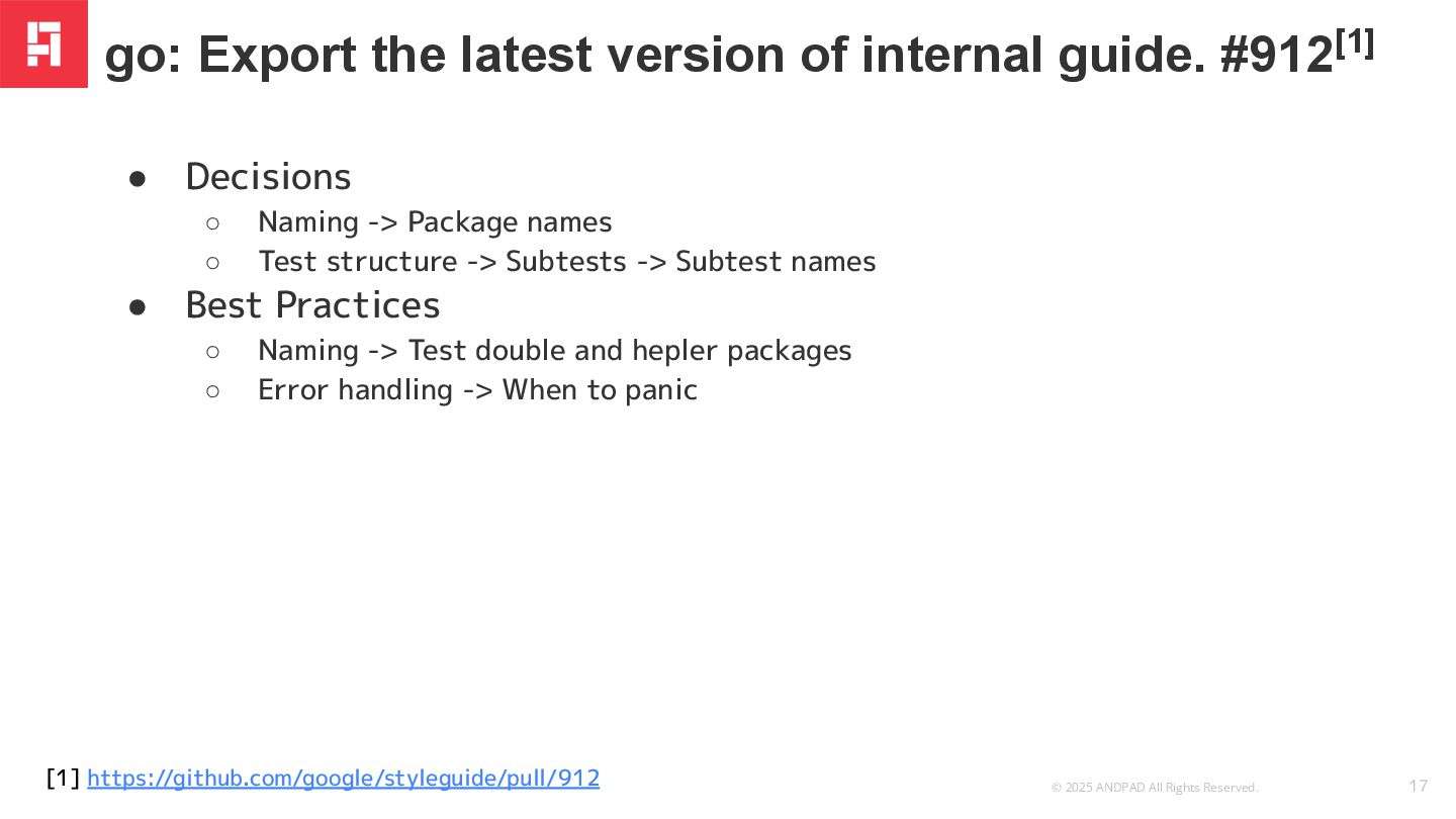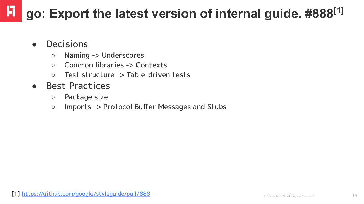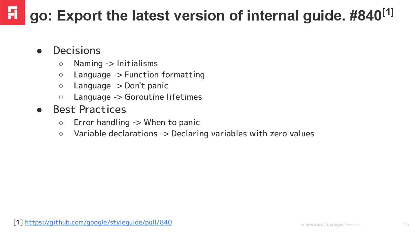 version of internal guide. #840[1] 15 • Decisions ◦ Naming -> Initialisms ◦ Language -> Function formatting ◦ Language -> Don't panic ◦ Language -> Goroutine lifetimes • Best Practices ◦ Error handling -> When to panic ◦ Variable declarations -> Declaring variables with zero values [1] https://github.com/google/styleguide/pull/840
