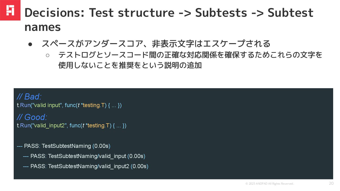Subtests -> Subtest names 20 • スペースがアンダースコア、非表示文字はエスケープされる ◦ テストログとソースコード間の正確な対応関係を確保するためこれらの文字を 使用しないことを推奨をという説明の追加 // Bad: t.Run("valid input", func(t *testing.T) { ... }) // Good: t.Run("valid_input2", func(t *testing.T) { ... }) --- PASS: TestSubtestNaming (0.00s) --- PASS: TestSubtestNaming/valid_input (0.00s) --- PASS: TestSubtestNaming/valid_input2 (0.00s)