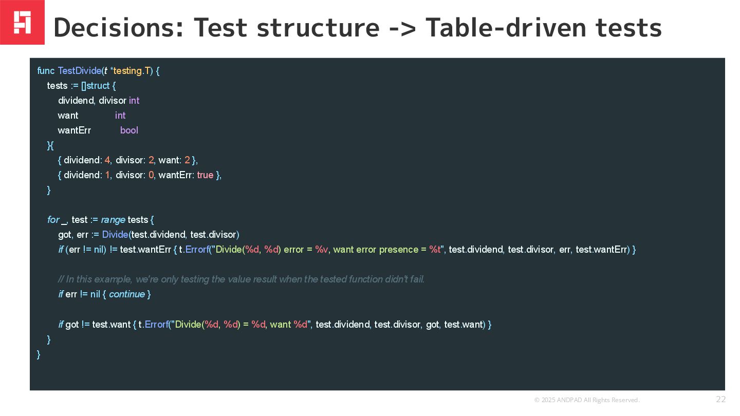 Table-driven tests 21 • コード例の追加 • 説明の追加 ◦ 一部のテストケースが基本的なエラーチェックだけを必要とするような場合には、既存の テストにそのケースを追加することが許容される ▪ ただし、シンプルに始まったものが成長して保守不可能になる可能性はあるので 注意は必要 ◦ テストヘルパーについて: テスト本体の可読性を維持するためにテスト設定を簡素化するの にも役立つ