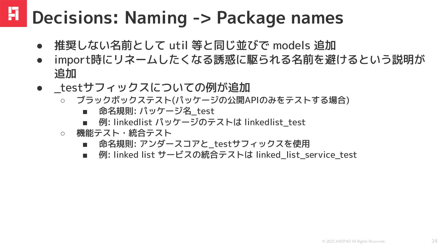 names 24 • 推奨しない名前として util 等と同じ並びで models 追加 • import時にリネームしたくなる誘惑に駆られる名前を避けるという説明が 追加 • _testサフィックスについての例が追加 ◦ ブラックボックステスト(パッケージの公開APIのみをテストする場合) ▪ 命名規則: パッケージ名_test ▪ 例: linkedlist パッケージのテストは linkedlist_test ◦ 機能テスト・統合テスト ▪ 命名規則: アンダースコアと_testサフィックスを使用 ▪ 例: linked list サービスの統合テストは linked_list_service_test