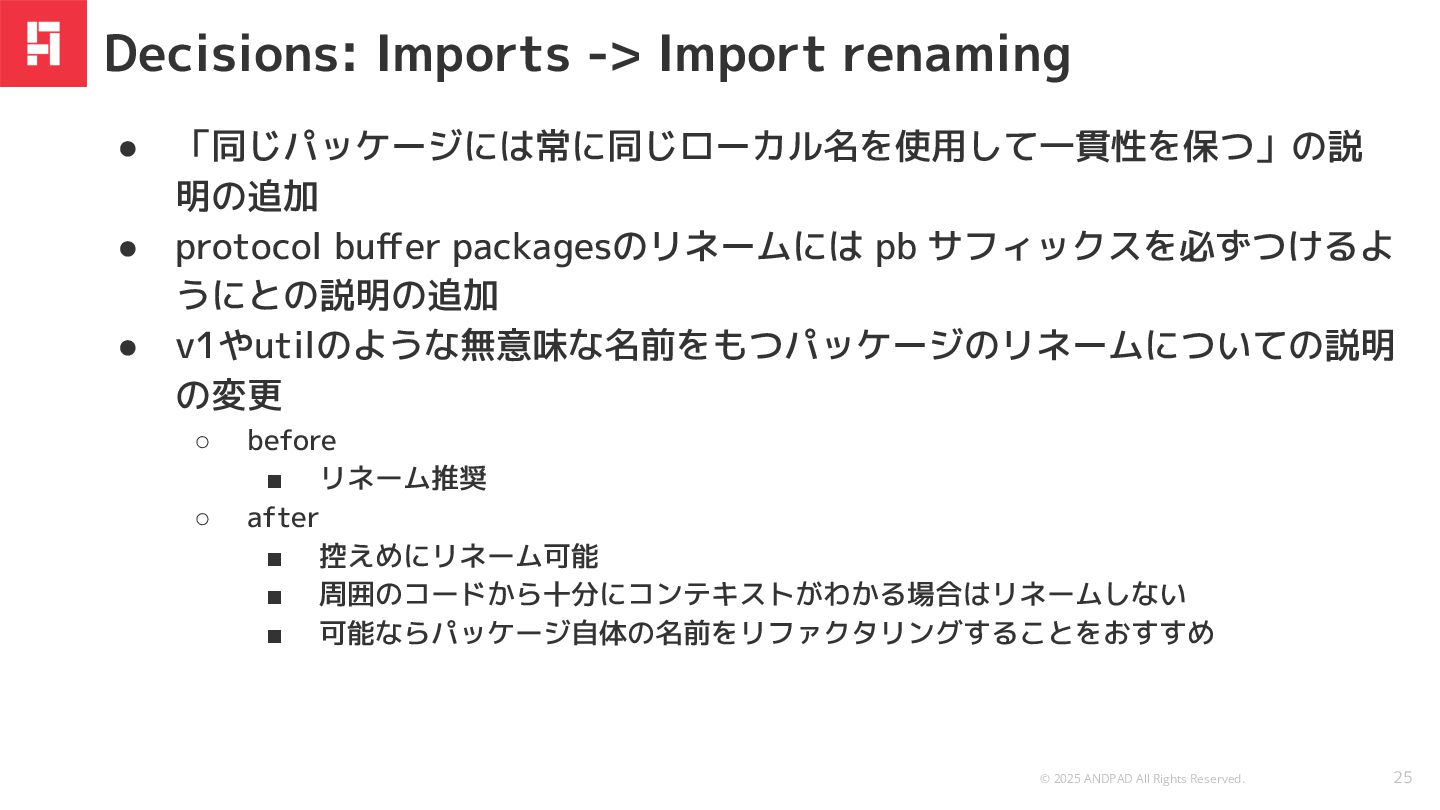 renaming 25 • 「同じパッケージには常に同じローカル名を使用して一貫性を保つ」の説 明の追加 • protocol buffer packagesのリネームには pb サフィックスを必ずつけるよ うにとの説明の追加 • v1やutilのような無意味な名前をもつパッケージのリネームについての説明 の変更 ◦ before ▪ リネーム推奨 ◦ after ▪ 控えめにリネーム可能 ▪ 周囲のコードから十分にコンテキストがわかる場合はリネームしない ▪ 可能ならパッケージ自体の名前をリファクタリングすることをおすすめ