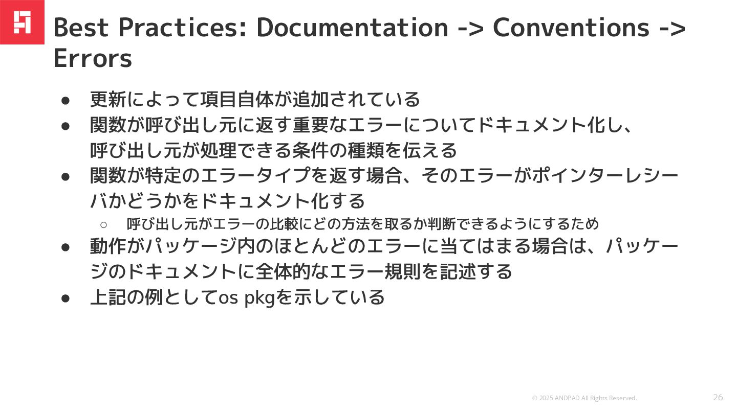 Conventions -> Errors 26 • 更新によって項目自体が追加されている • 関数が呼び出し元に返す重要なエラーについてドキュメント化し、 呼び出し元が処理できる条件の種類を伝える • 関数が特定のエラータイプを返す場合、そのエラーがポインターレシー バかどうかをドキュメント化する ◦ 呼び出し元がエラーの比較にどの方法を取るか判断できるようにするため • 動作がパッケージ内のほとんどのエラーに当てはまる場合は、パッケー ジのドキュメントに全体的なエラー規則を記述する • 上記の例としてos pkgを示している