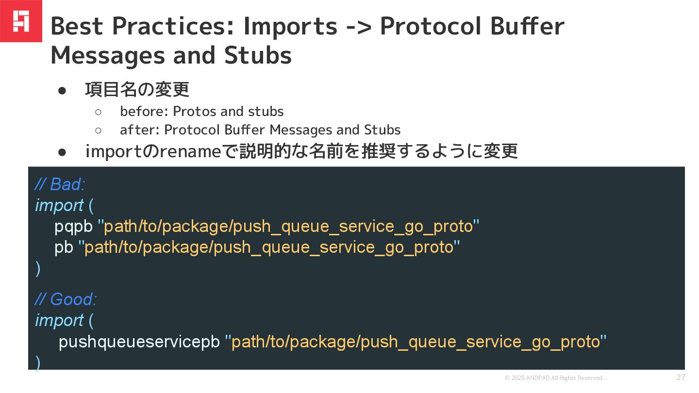 Protocol Buffer Messages and Stubs 27 • 項目名の変更 ◦ before: Protos and stubs ◦ after: Protocol Buffer Messages and Stubs • importのrenameで説明的な名前を推奨するように変更 // Bad: import ( pqpb "path/to/package/push_queue_service_go_proto" pb "path/to/package/push_queue_service_go_proto" ) // Good: import ( pushqueueservicepb "path/to/package/push_queue_service_go_proto" )