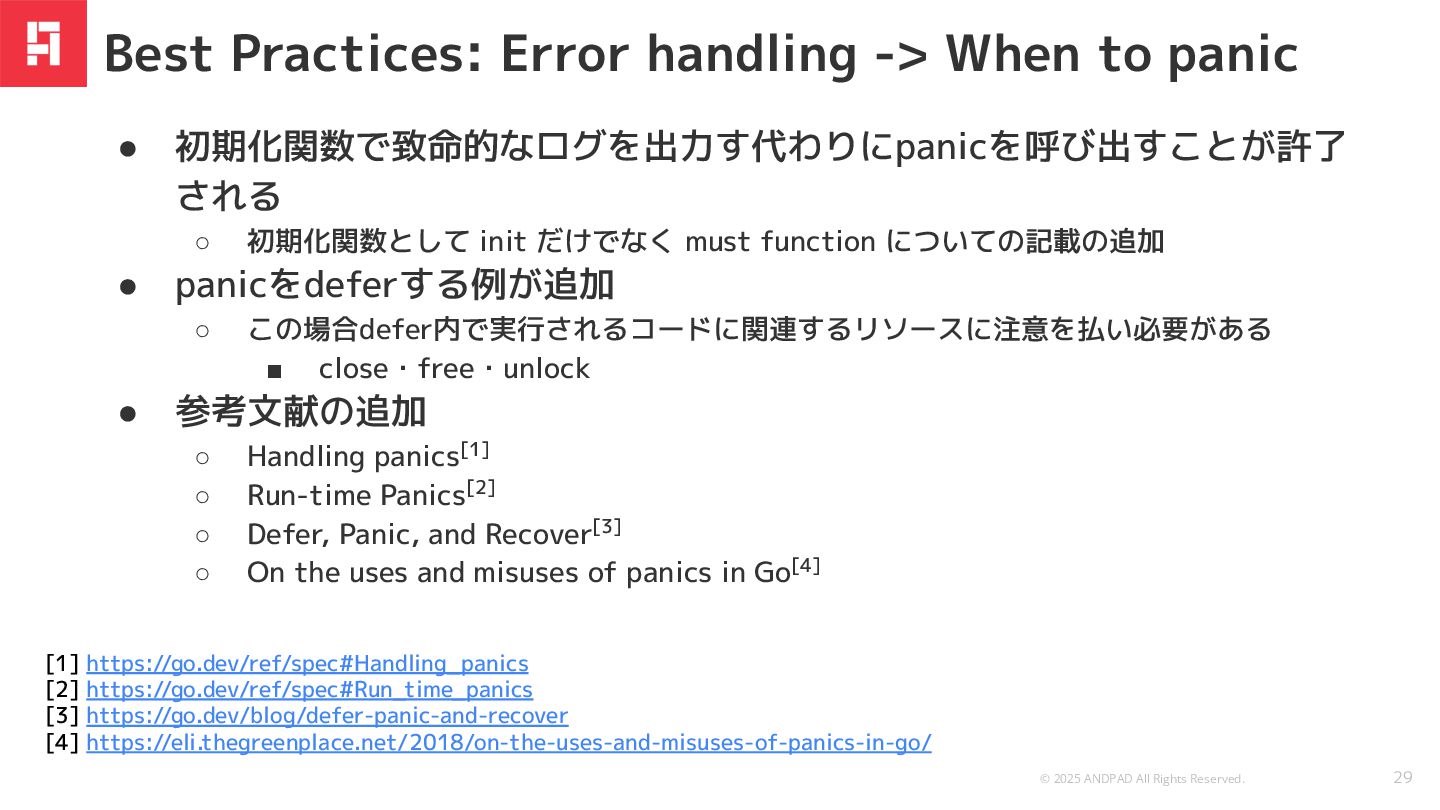 -> When to panic 29 • 初期化関数で致命的なログを出力す代わりにpanicを呼び出すことが許了 される ◦ 初期化関数として init だけでなく must function についての記載の追加 • panicをdeferする例が追加 ◦ この場合defer内で実行されるコードに関連するリソースに注意を払い必要がある ▪ close・free・unlock • 参考文献の追加 ◦ Handling panics[1] ◦ Run-time Panics[2] ◦ Defer, Panic, and Recover[3] ◦ On the uses and misuses of panics in Go[4] [1] https://go.dev/ref/spec#Handling_panics [2] https://go.dev/ref/spec#Run_time_panics [3] https://go.dev/blog/defer-panic-and-recover [4] https://eli.thegreenplace.net/2018/on-the-uses-and-misuses-of-panics-in-go/