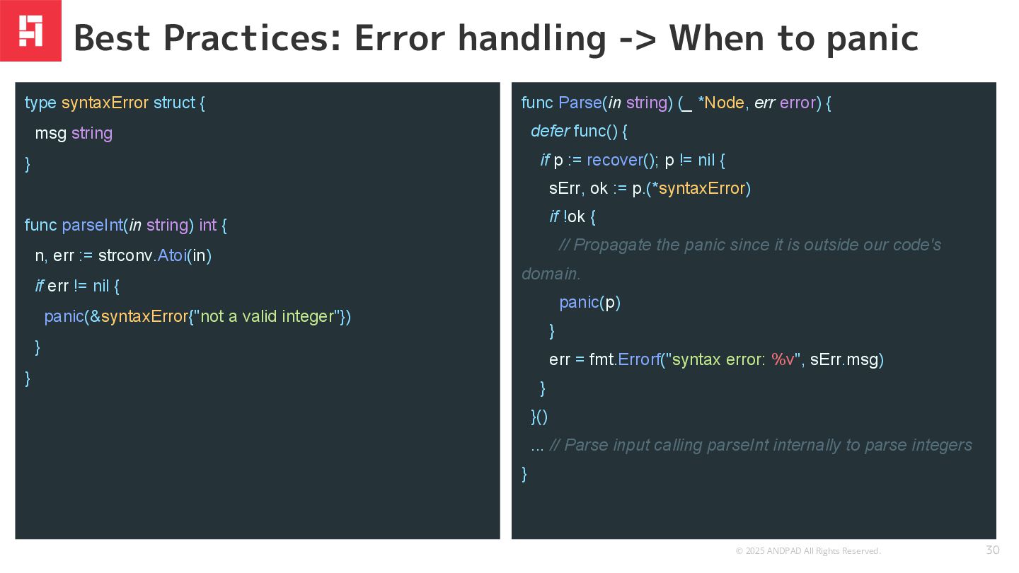 -> When to panic 30 type syntaxError struct { msg string } func parseInt(in string) int { n, err := strconv.Atoi(in) if err != nil { panic(&syntaxError{"not a valid integer"}) } } func Parse(in string) (_ *Node, err error) { defer func() { if p := recover(); p != nil { sErr, ok := p.(*syntaxError) if !ok { // Propagate the panic since it is outside our code's domain. panic(p) } err = fmt.Errorf("syntax error: %v", sErr.msg) } }() ... // Parse input calling parseInt internally to parse integers }