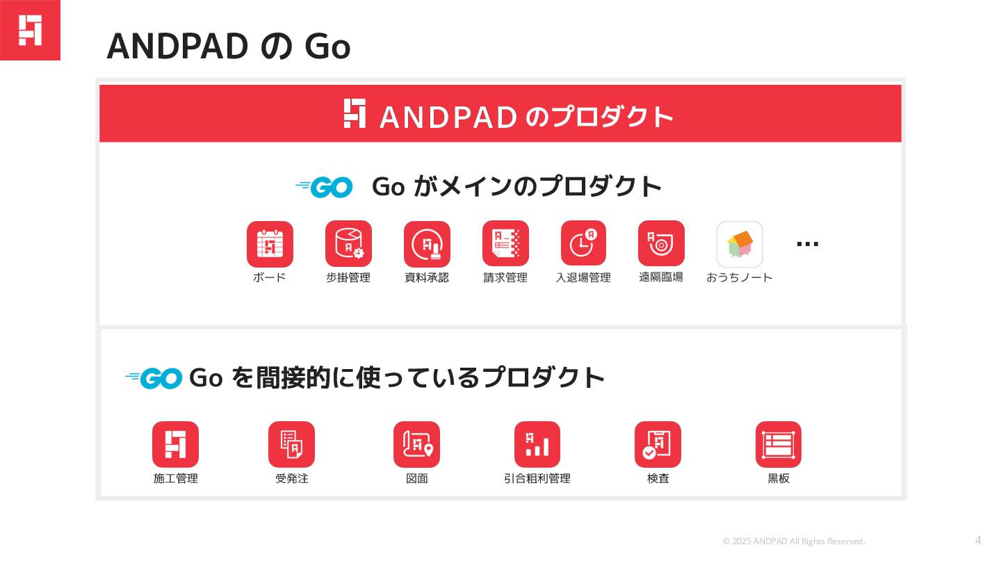 4. © 2025 ANDPAD All Rights Reserved. Go を間接的に使っているプロダクト ANDPAD の