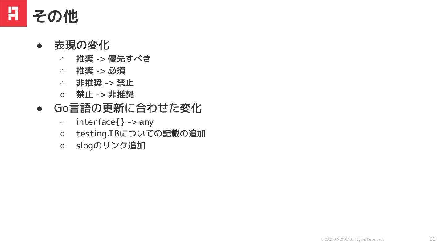 ◦ 推奨 -> 優先すべき ◦ 推奨 -> 必須 ◦ 非推奨 -> 禁止 ◦ 禁止 -> 非推奨 • Go言語の更新に合わせた変化 ◦ interface{} -> any ◦ testing.TBについての記載の追加 ◦ slogのリンク追加