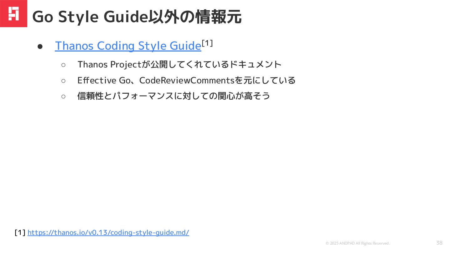 Thanos Coding Style Guide[1] ◦ Thanos Projectが公開してくれているドキュメント ◦ Effective Go、CodeReviewCommentsを元にしている ◦ 信頼性とパフォーマンスに対しての関心が高そう [1] https://thanos.io/v0.13/coding-style-guide.md/ 38