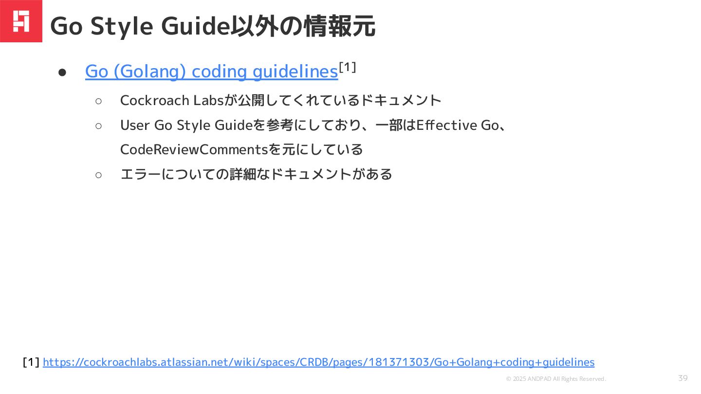 Go (Golang) coding guidelines[1] ◦ Cockroach Labsが公開してくれているドキュメント ◦ User Go Style Guideを参考にしており、一部はEffective Go、 CodeReviewCommentsを元にしている ◦ エラーについての詳細なドキュメントがある [1] https://cockroachlabs.atlassian.net/wiki/spaces/CRDB/pages/181371303/Go+Golang+coding+guidelines 39
